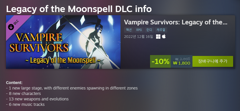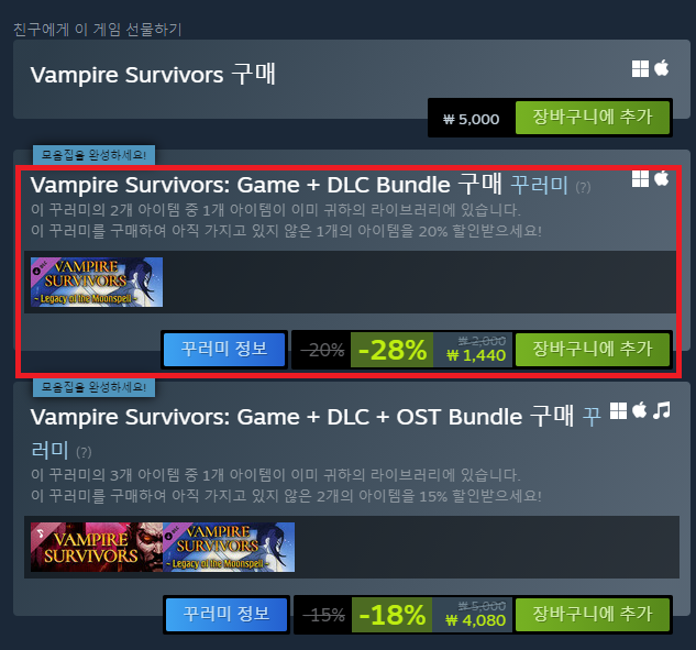 만약에 구매를 한다면 Vampire Survivors: Game + DLC Bundle 1,440원짜리 구매 하면 된다.