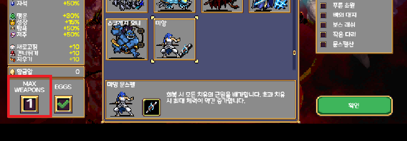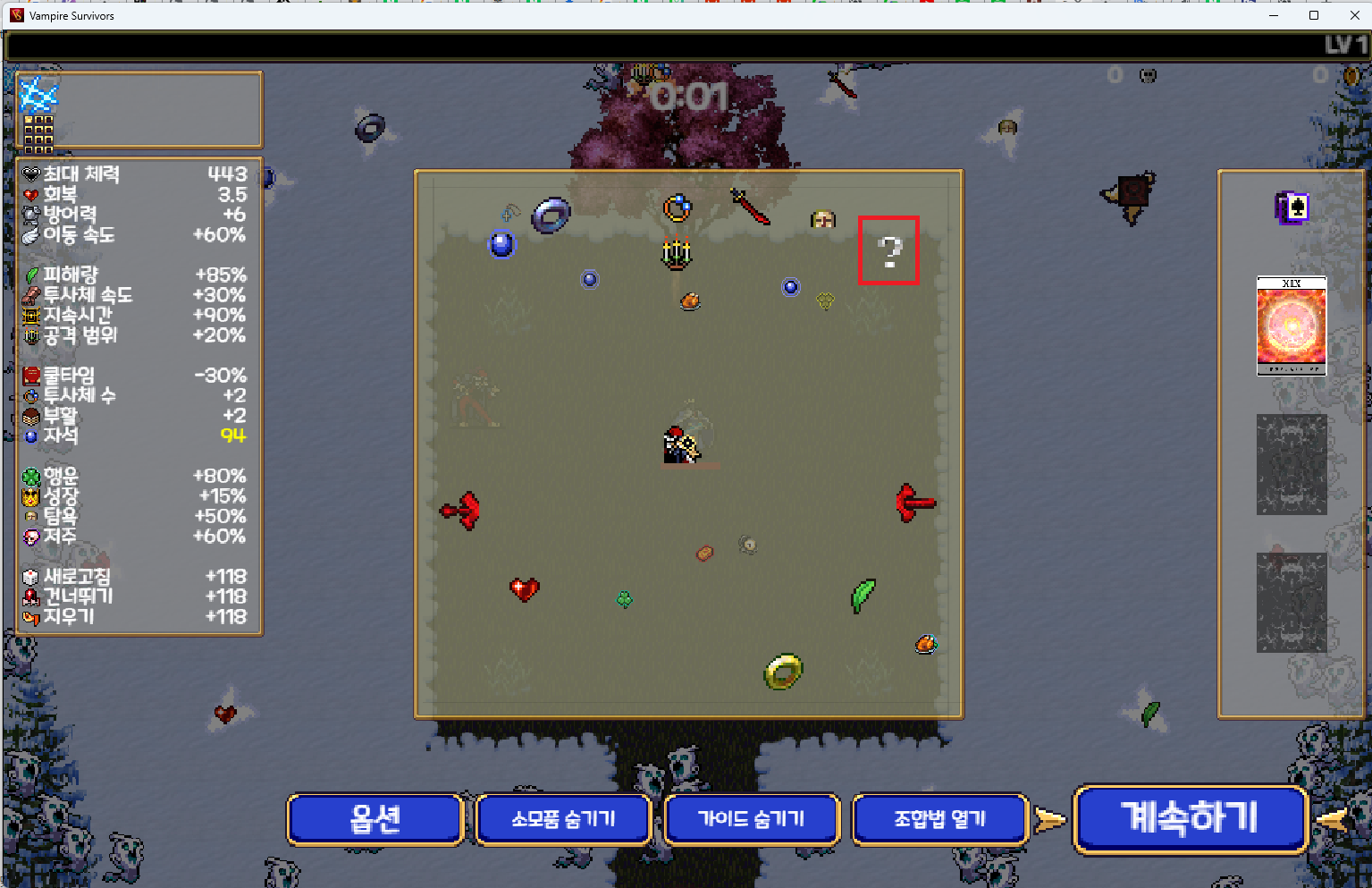무기는 1개만 선택, 하고 진행 아무것도 안해도 캐릭터가 강해서 안죽는다.