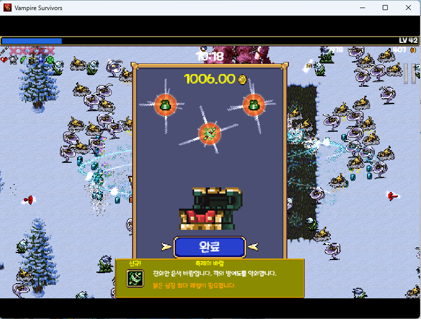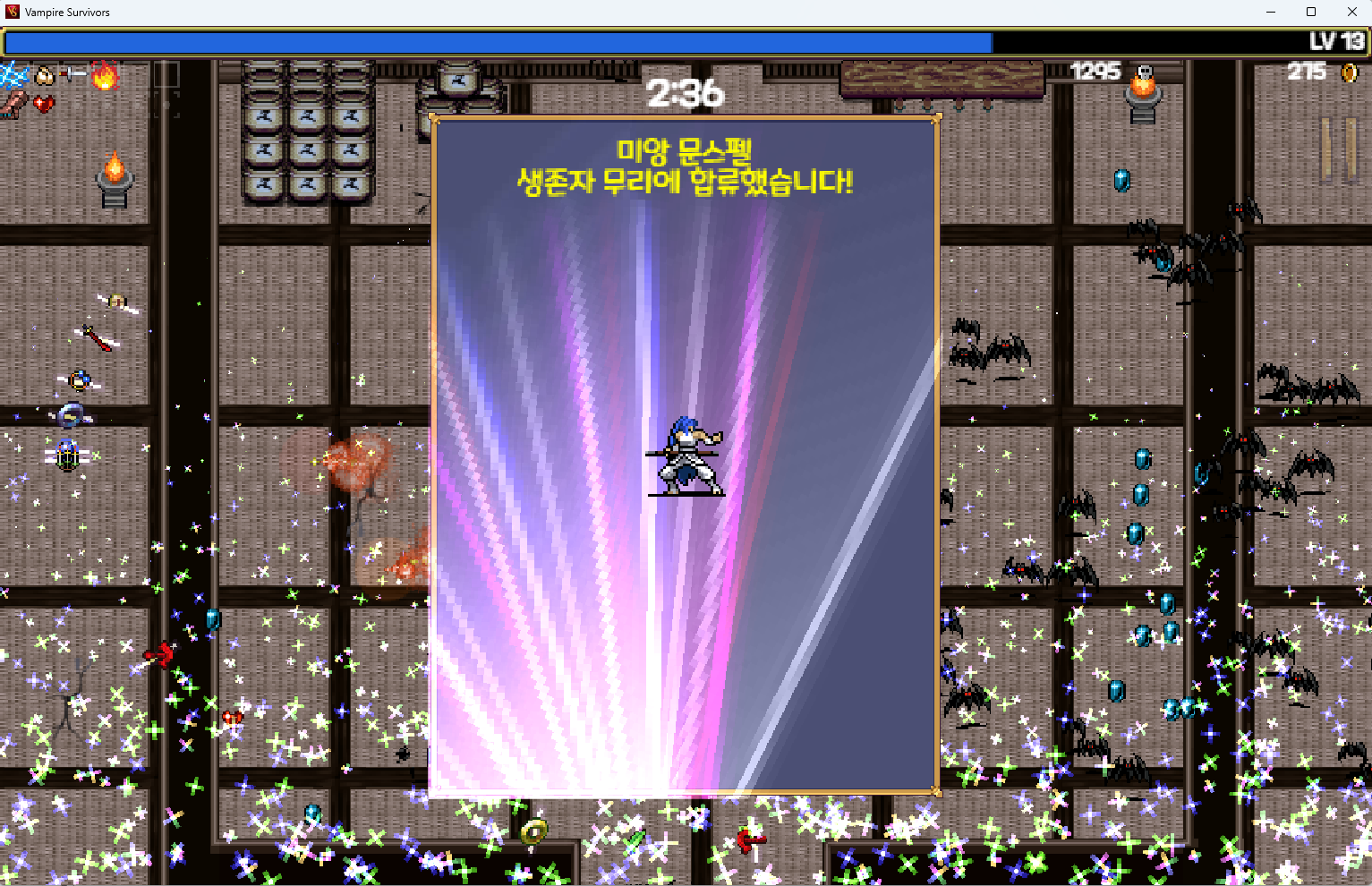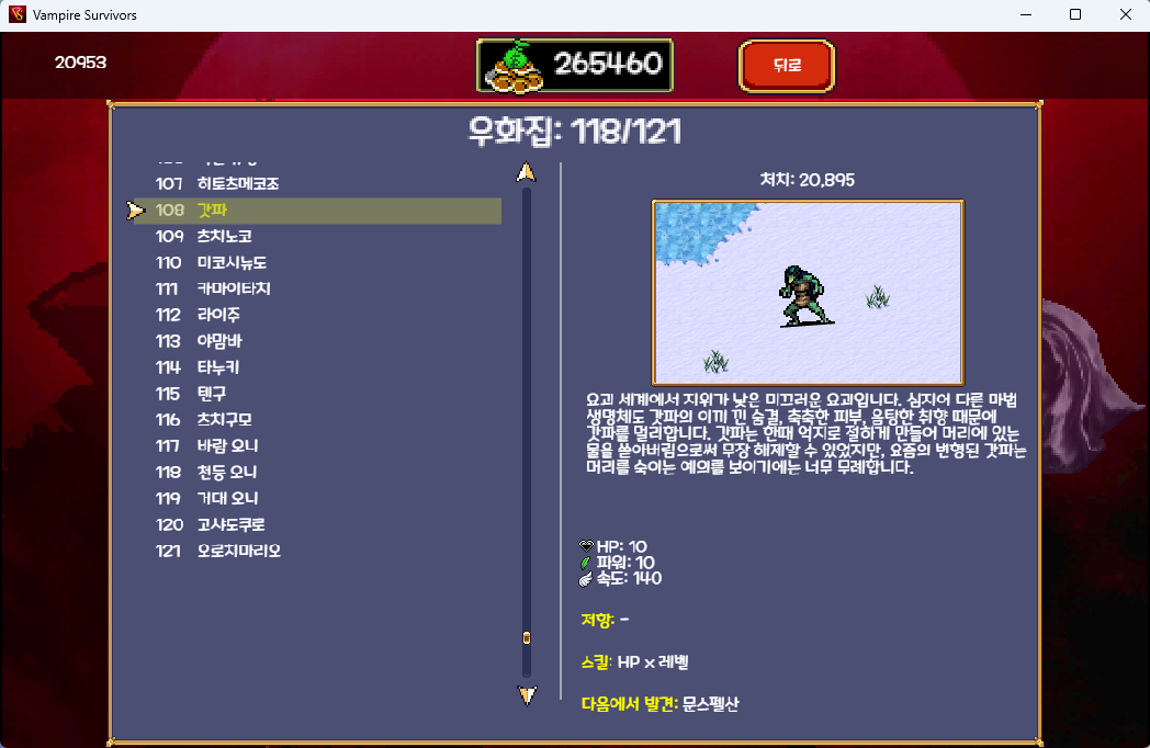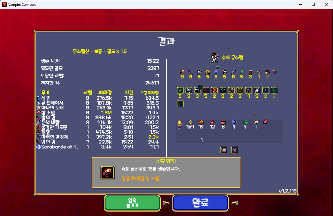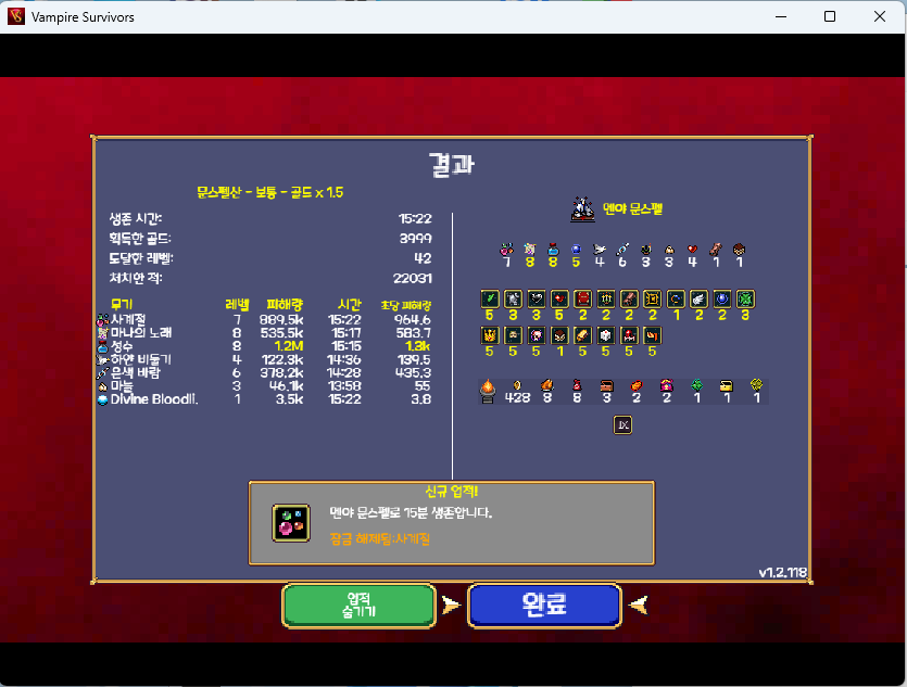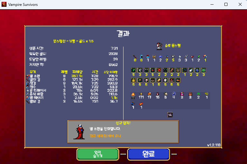 뱀파이어 서바이버즈(Vampire Survivors) 뱀파이어 서바이벌 1.2 패치로 변경된점 (2) 저번에 이어서 두번째 이다. 10번째 업적은 바비, 문스펠산 선택하고 15분 생존하면 된다. 몸이 약하니 잘 이리저리