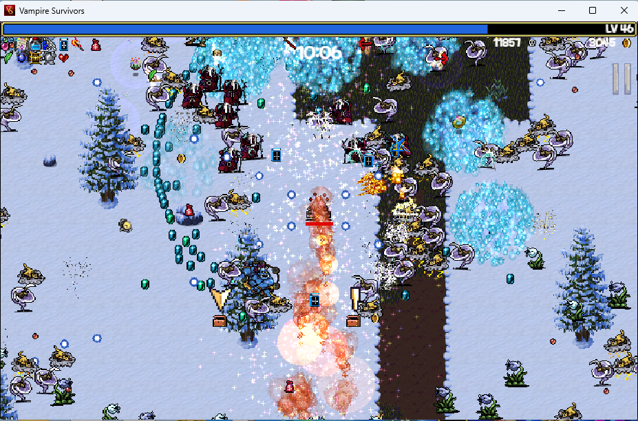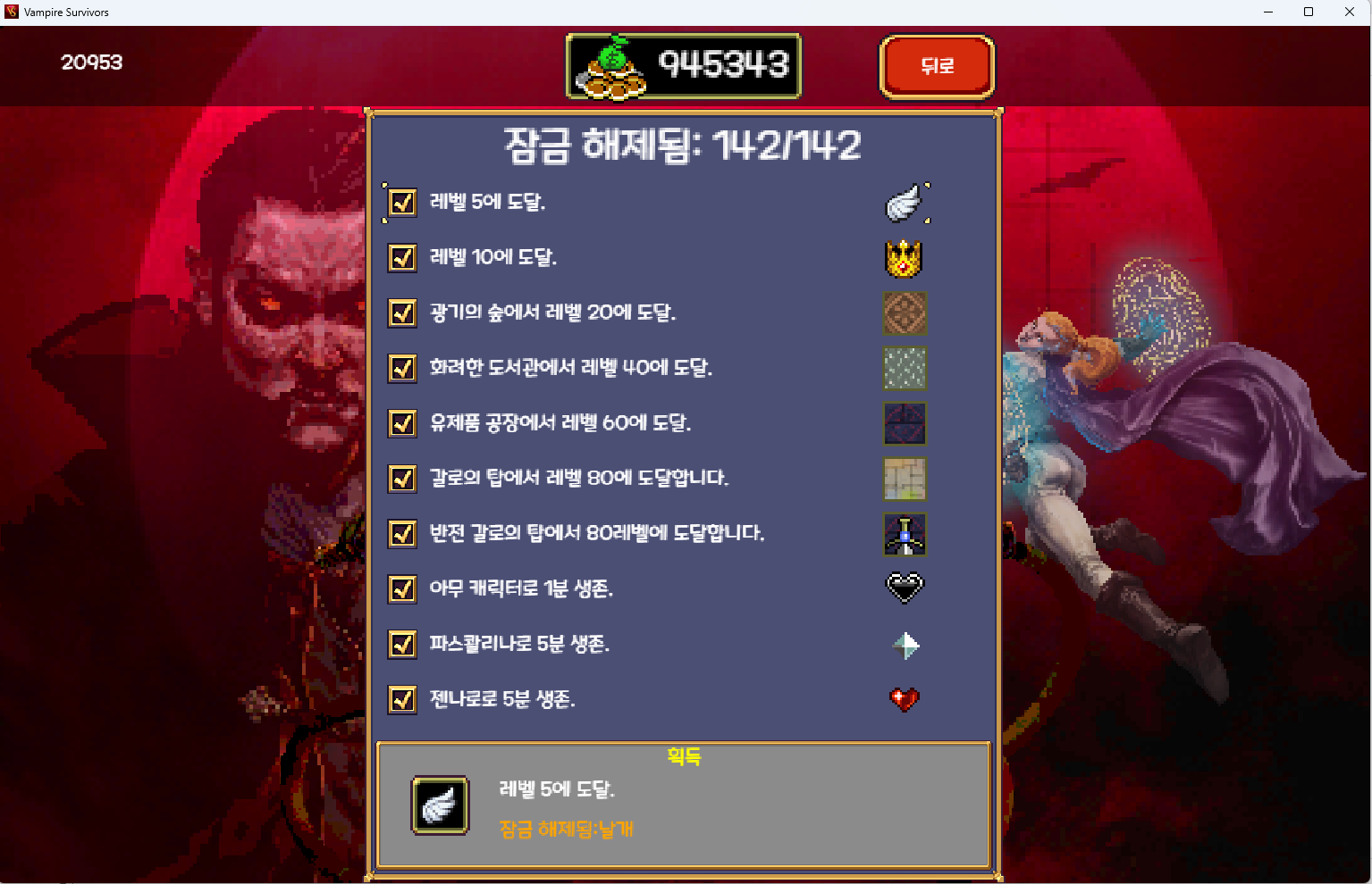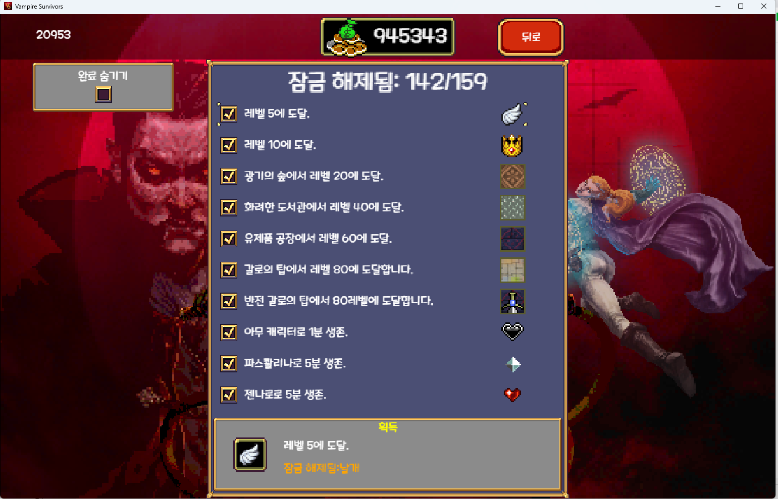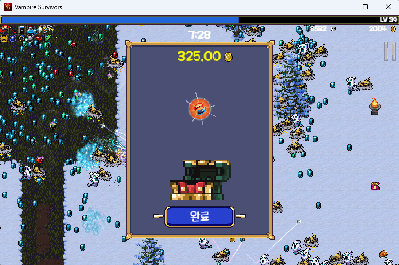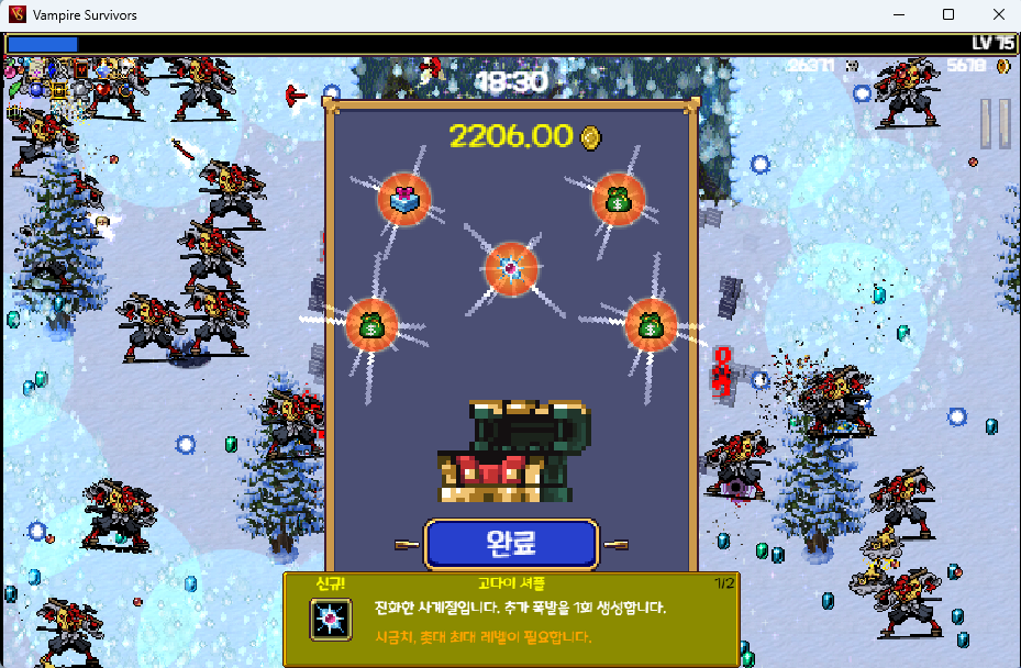 뱀파이어 서바이버즈(Vampire Survivors) 뱀파이어 서바이벌 1.2 패치로 변경된점 (2) 저번에 이어서 두번째 이다. 10번째 업적은 바비, 문스펠산 선택하고 15분 생존하면 된다. 몸이 약하니 잘 이리저리