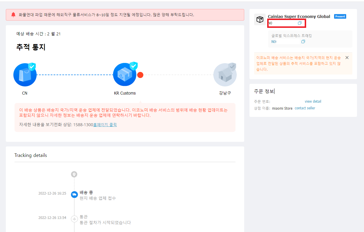 알리 구매시 이코노미가 아닌 스텐다드 이상 배송을 이용을 하면 국내에서도 택배 조회가 가능하다.