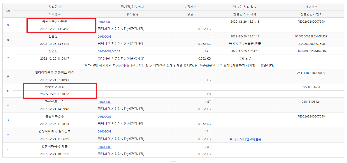12월 24일 입항 되었고 26일 심사 완료 되었다.