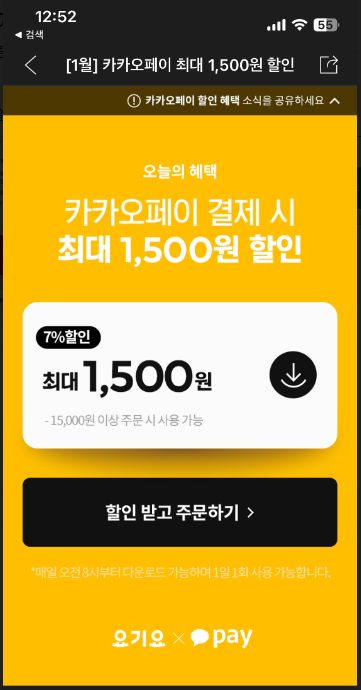 카카오페이 15,000원 이상 결제시 7%로 할인 최대 1,500원 할인