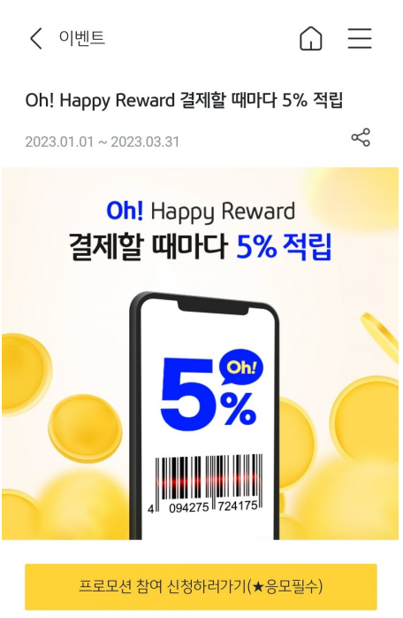 아 추가로 Oh! Happy Reward 결제할 때마다 5% 적립 이벤트가 3월달까지 진행 된다.