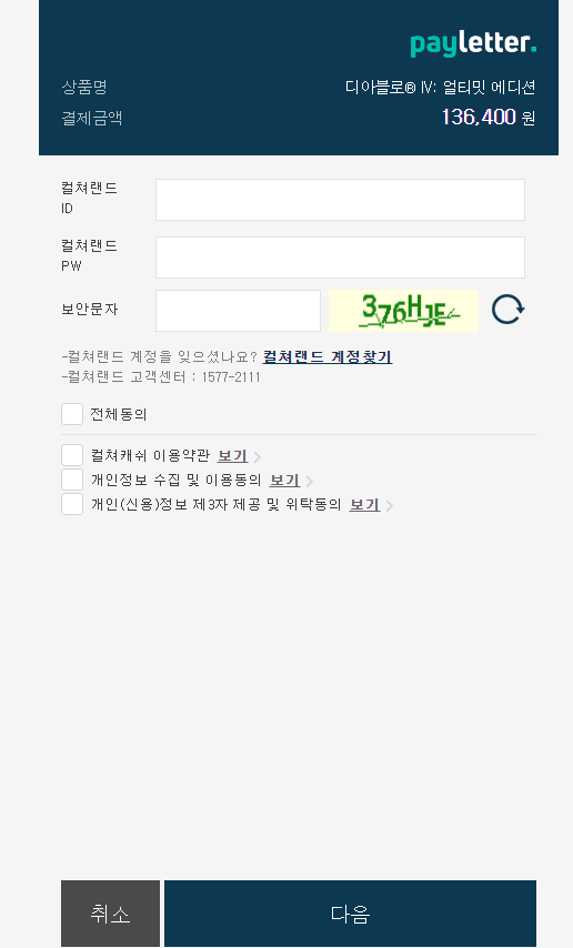 컬쳐랜드 아이디 암호를 입력하고 결제를 진행 하면 된다.
