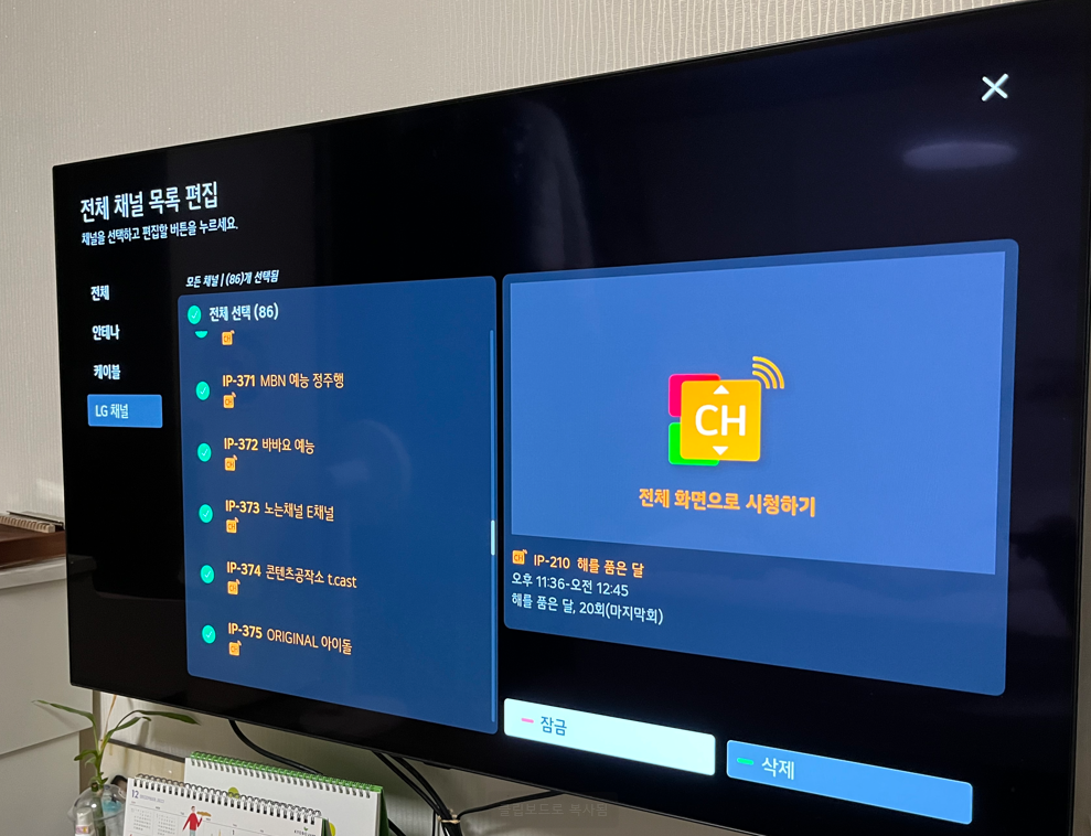 LG 채널에 들어가서 모든 채널 선택하고 삭제를 누르면 된다.