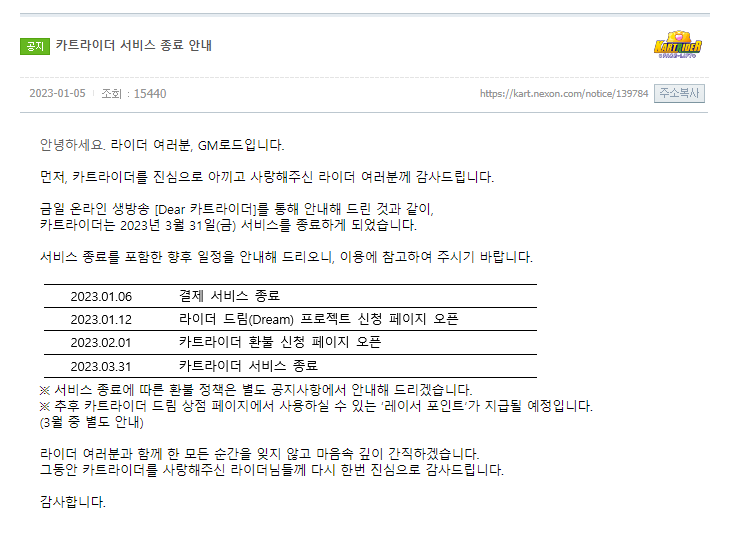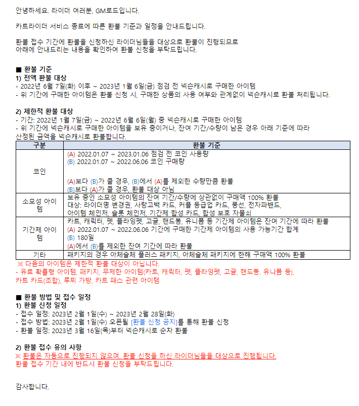 환불도 진행 하고 있으니 카트라이더 과금한 사용자는 기간내 환불을 신청 하도록 하자~