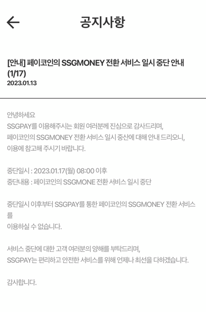 페이코인의 SSGMONEY 전환 서비스 일시 중단 공지..