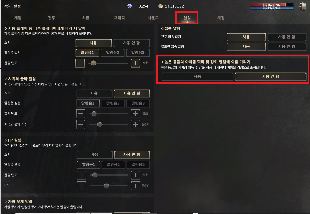 높은 등급의 아이템 획득 및 강화 알림에 이름 가리기 사용을 선택 하면 된다.