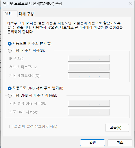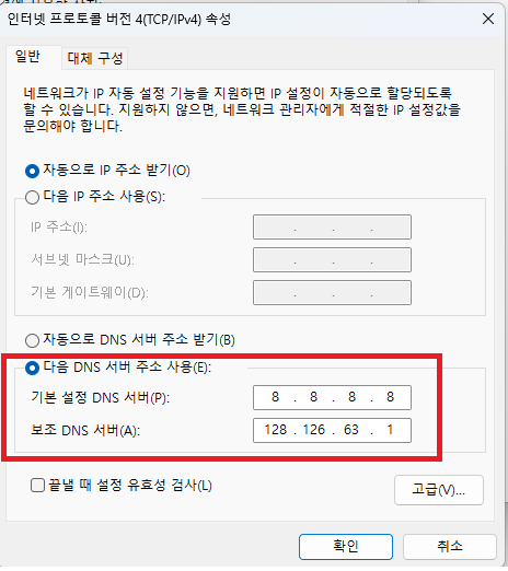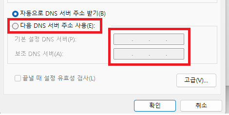 아래 다음 DNS 서버 주소 사용 여기를 선택 하면 입력을 할 수 있다.