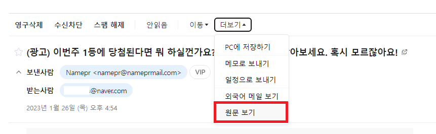 보통 스팸메일 확인 하는 방법은 헤더값을 확인 하는 방법이다.
