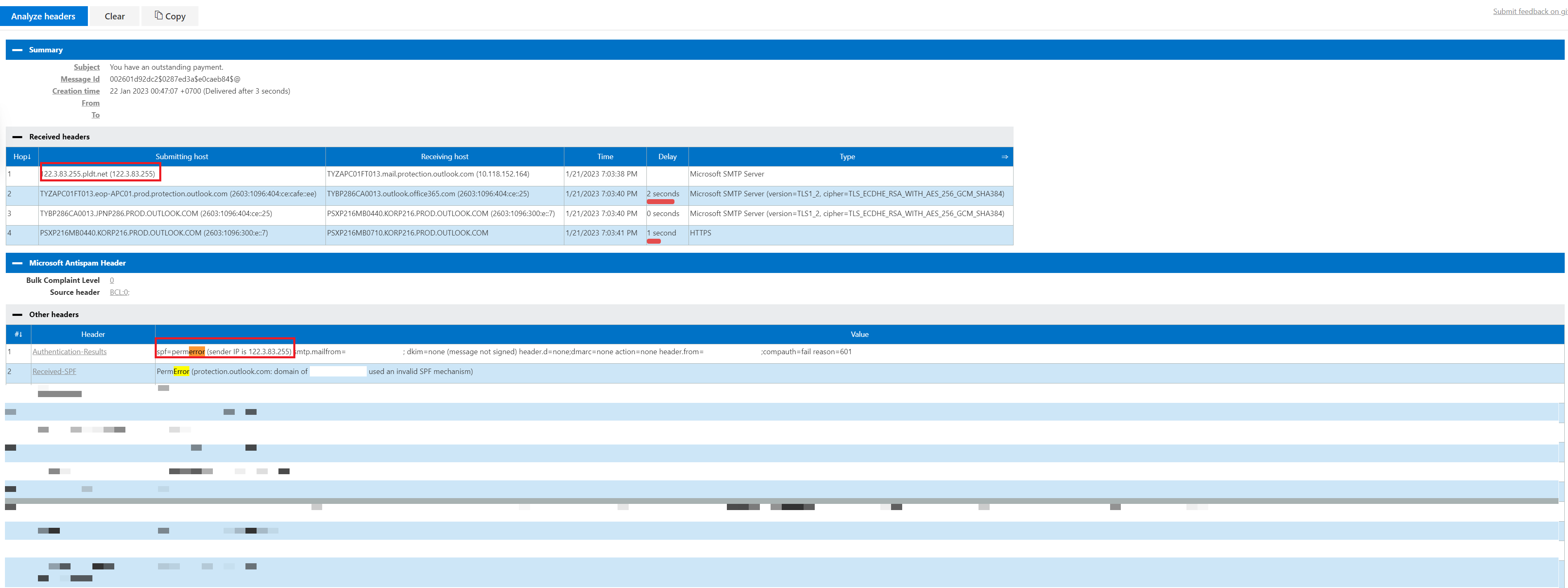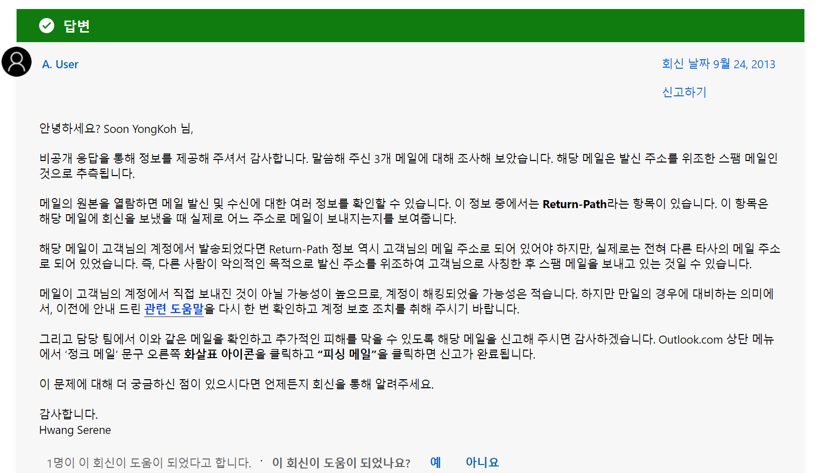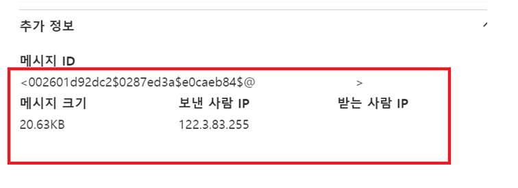 보낸 사람 IP가 필리핀 IP로 나온다. 하지만 내 계정은 털린게 없고 로그인 기록을 봐도 필리핀이나 다른 곳에서 접속 기록은 전혀 없다 그래도 찜찜해서 MS에 문의를 했더니 좀 시간이 걸렸지만 원인을 파악 했다.