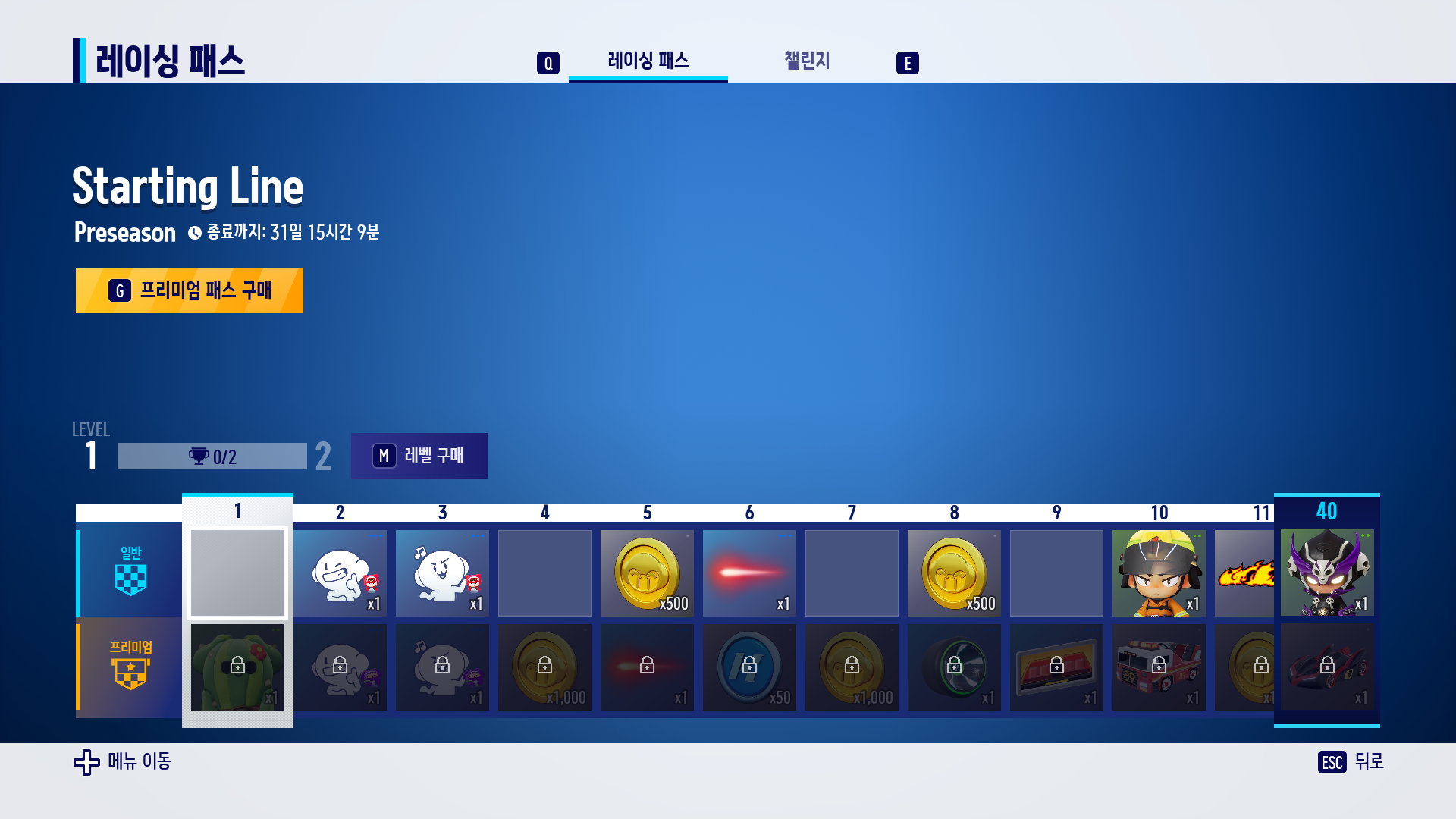 레이싱 패스(게임패스)도 있다. 요즘 무료게임들 거의대부분 가지고 있는 과금요소이다.