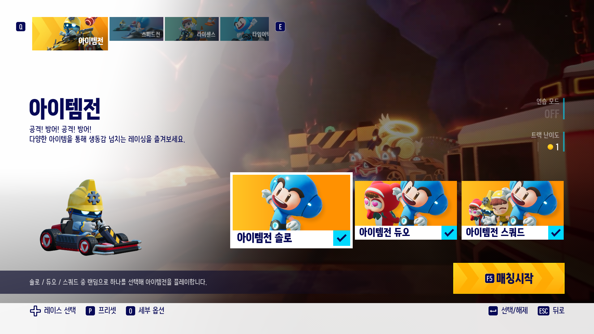 예전 카트라이더와 똑같다 향상된 그래픽과 다양한 맵 그리고 팀전이 새롭게 추가 된듯 하다.