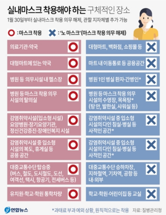 설 연휴 이후 1월 30일부터 1단계 의무 조정 시행으로 실외에 이어 실내에서도 마스크를 자율적으로 착용하도록 권고로 전환함