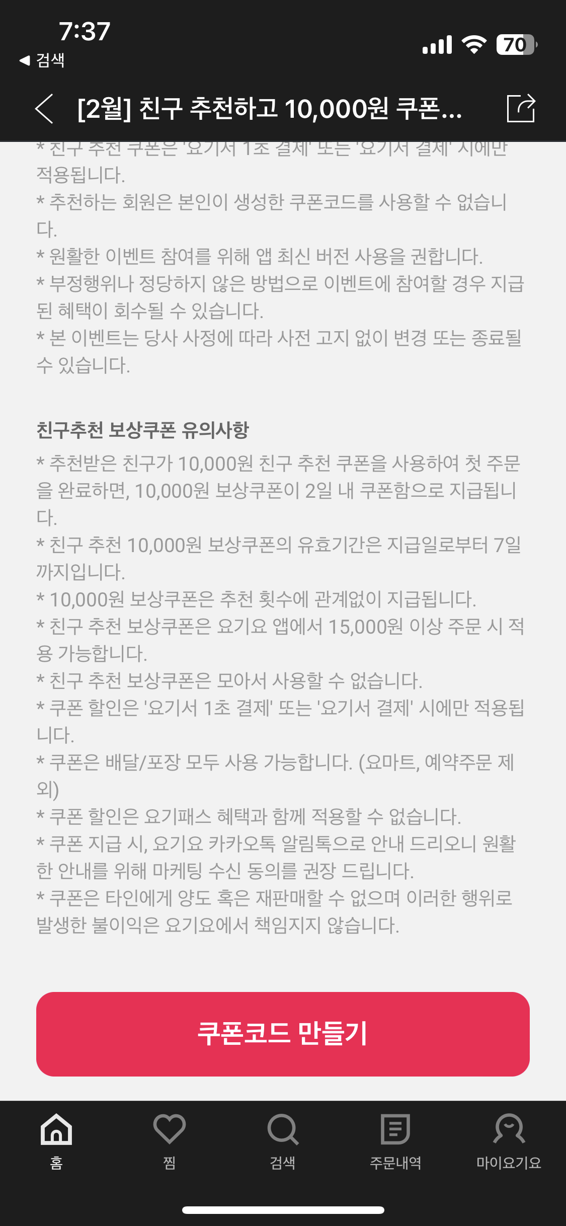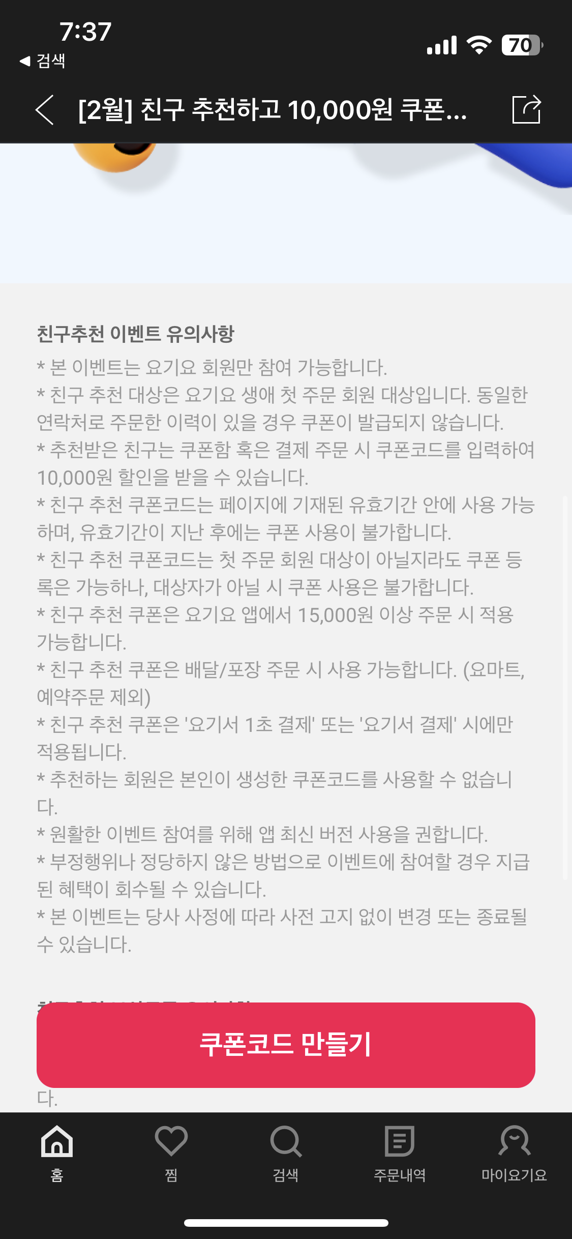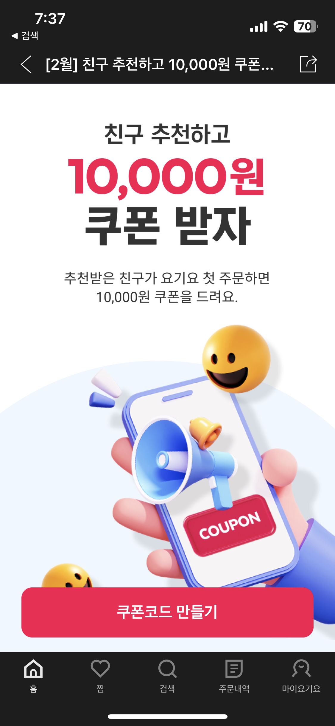 친구 이벤트가 있는데 뭐.. 필요한 사람들 쿠폰코드 만들어서 친구 초대 하고 친구가 결제 하면 2일 안에 1만원 쿠폰을 받게 된다.