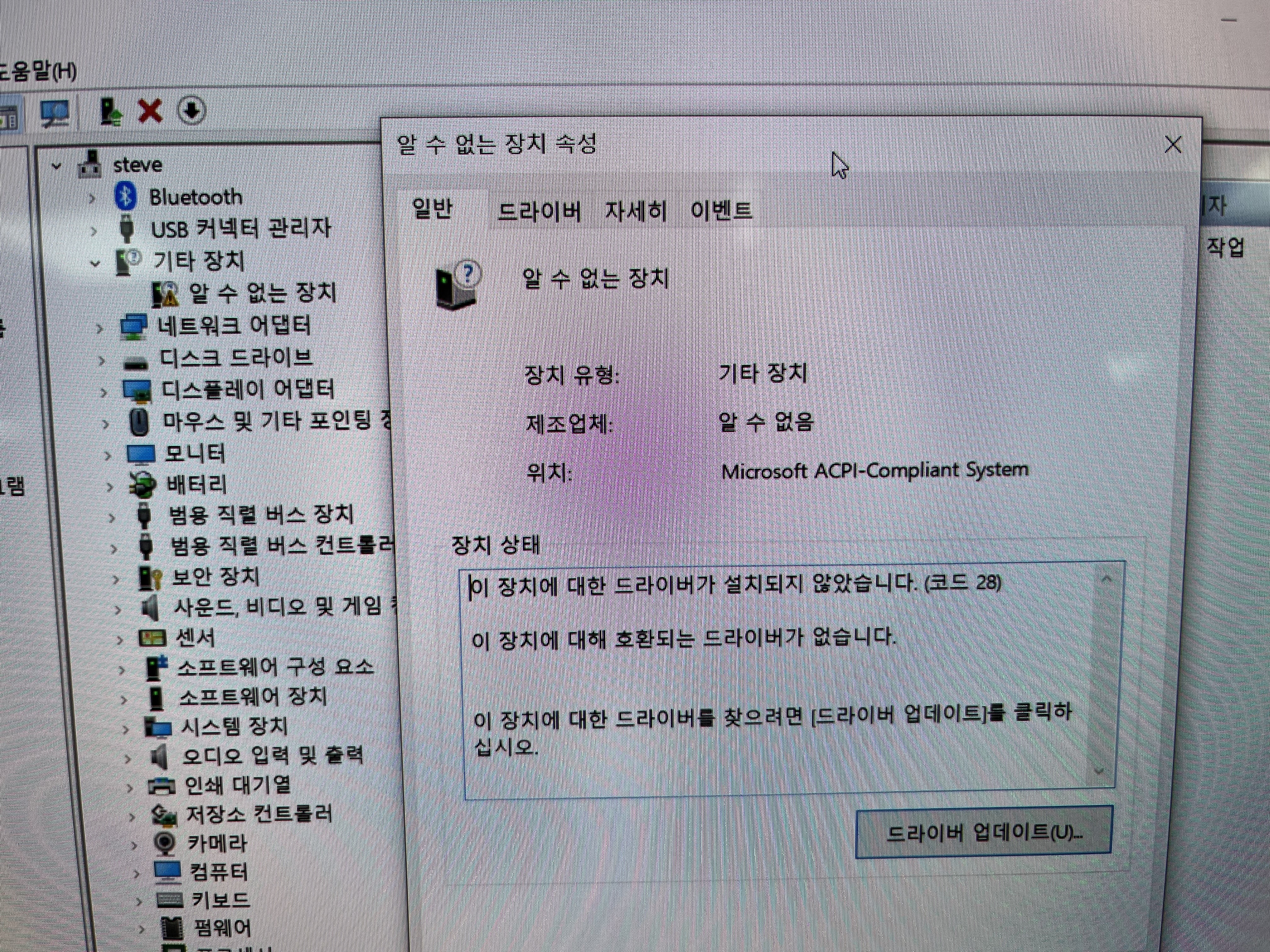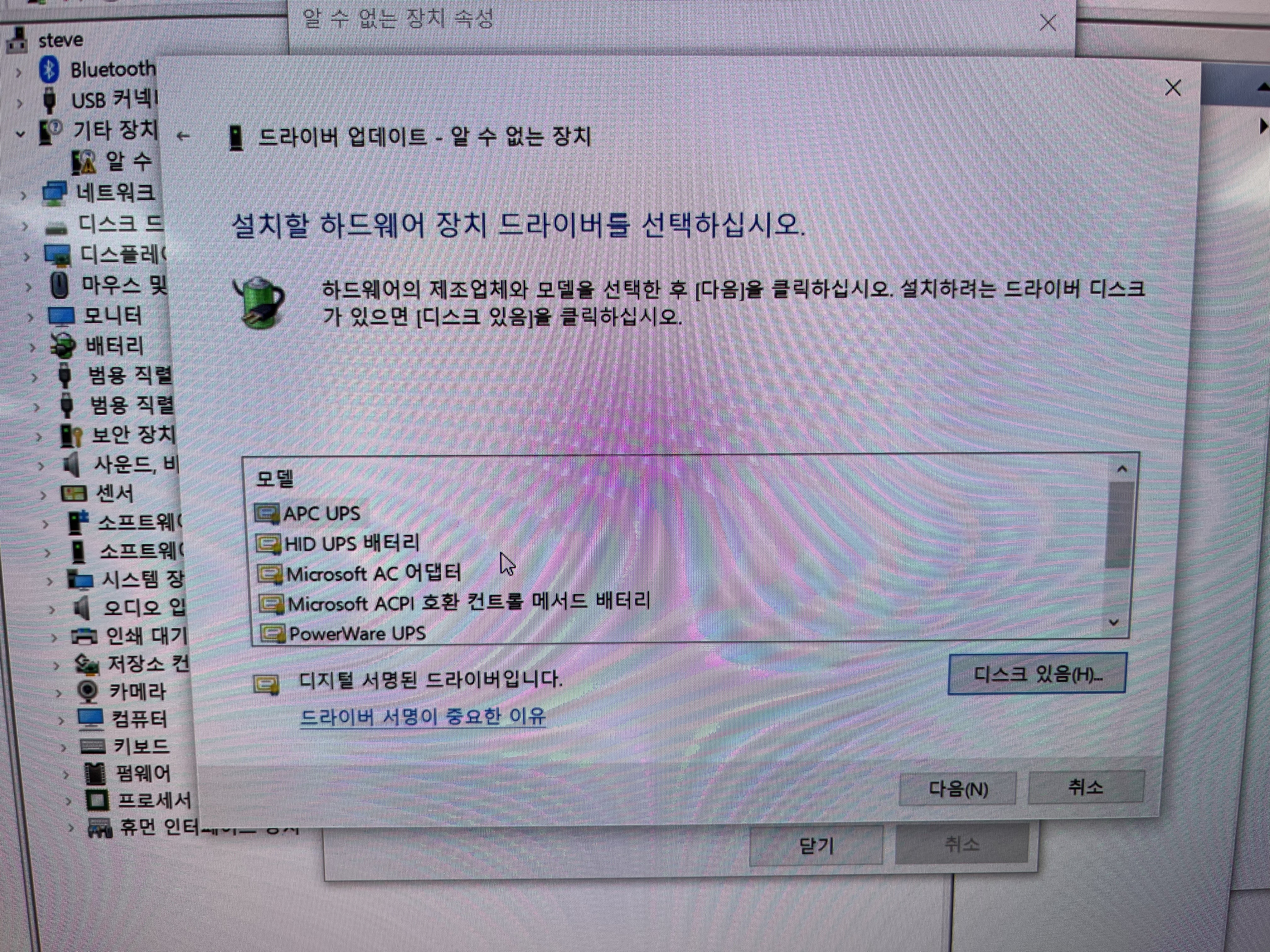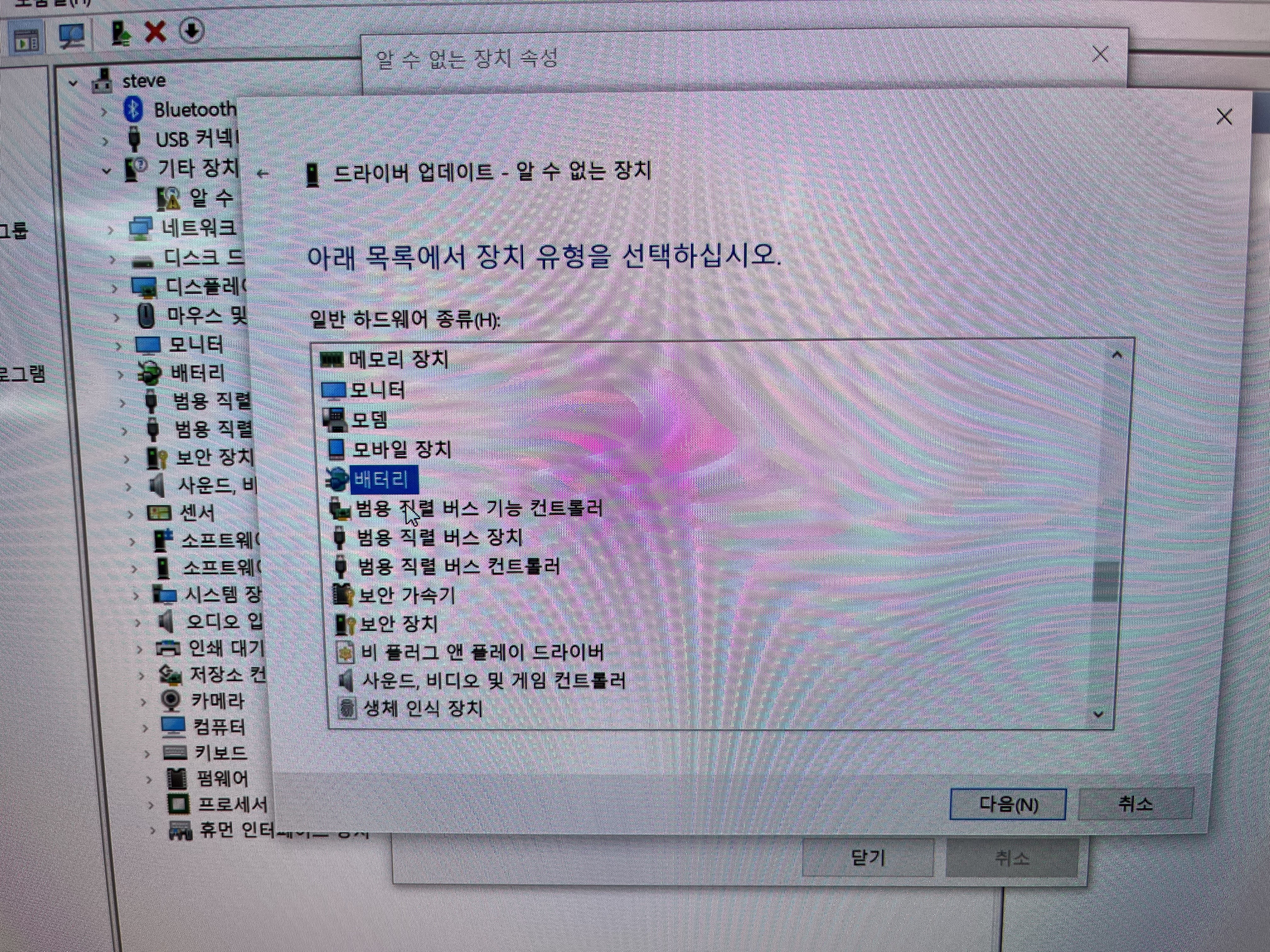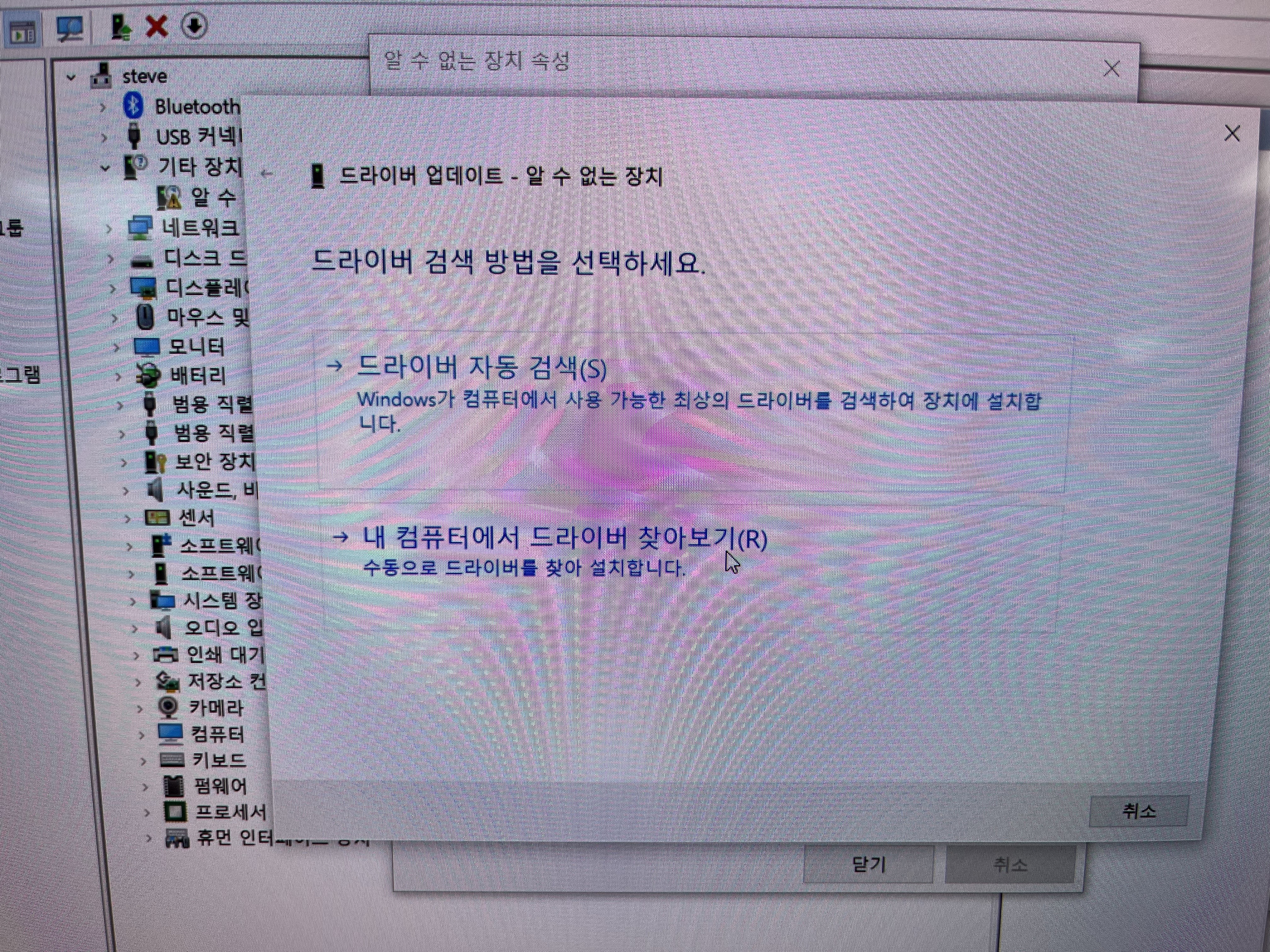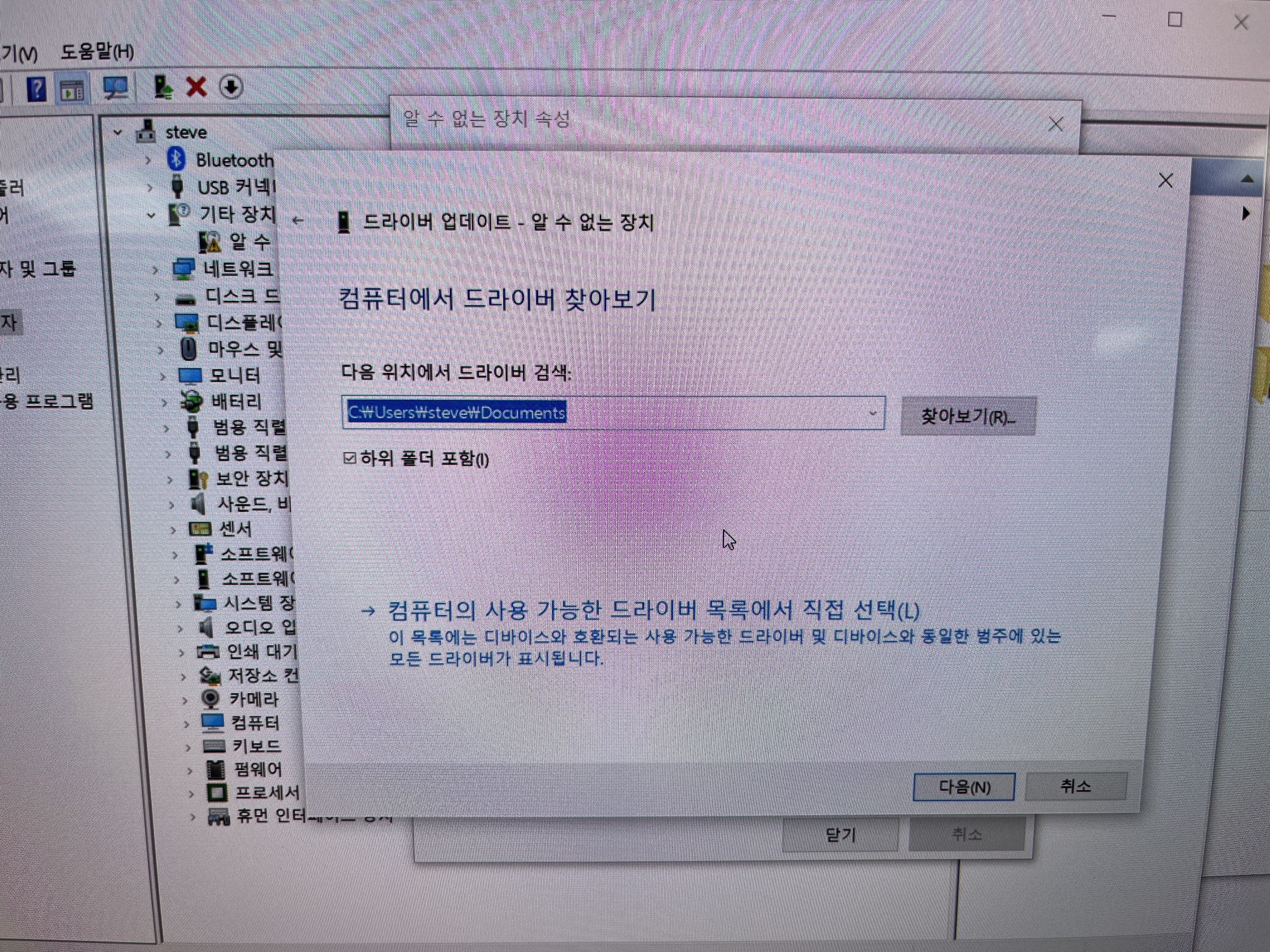 드라이버 업데이트 눌러서 내컴퓨터에서 드라이버 찾기