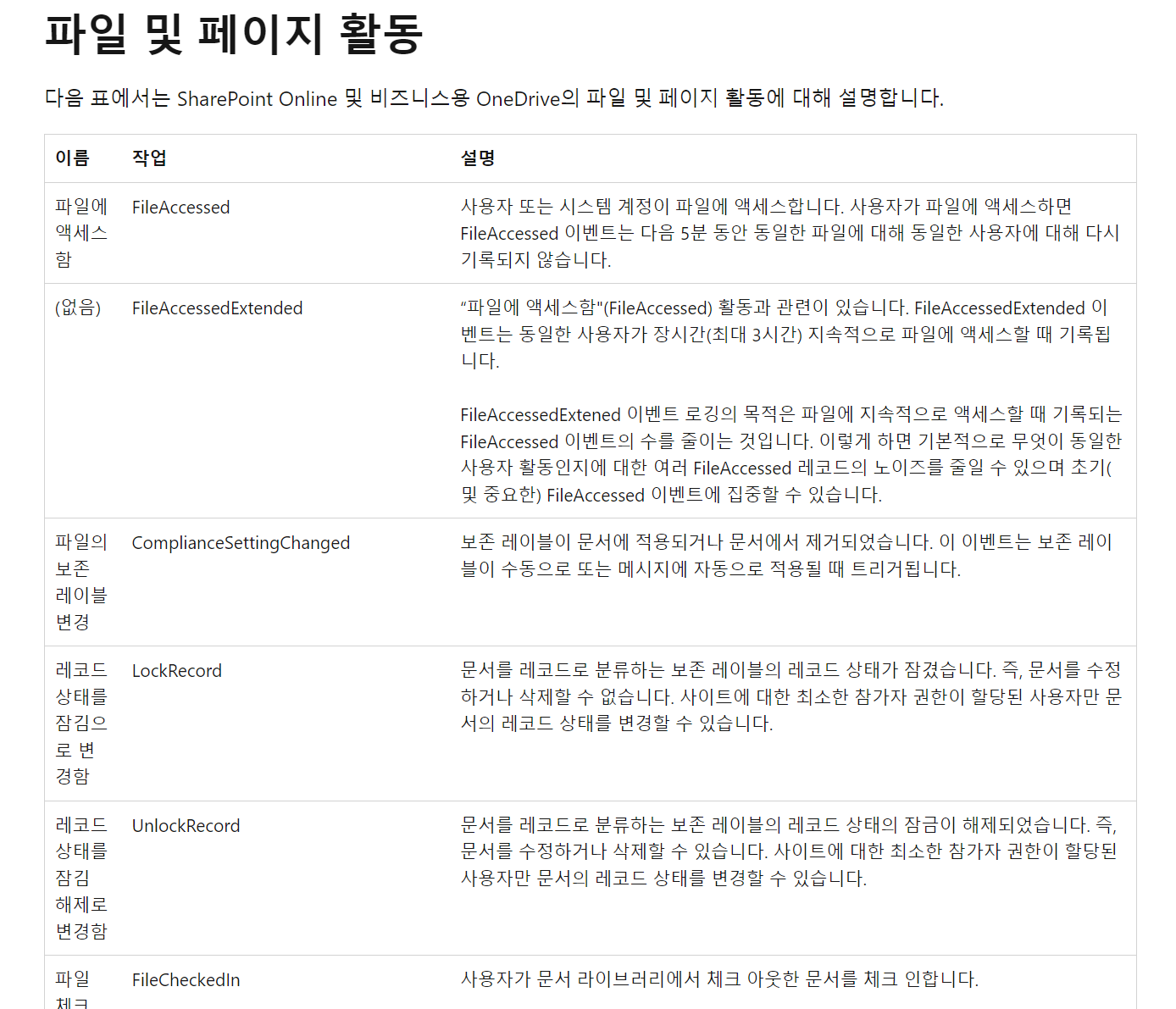 https://learn.microsoft.com/ko-kr/microsoft-365/compliance/audit-log-activities?view=o365-worldwide