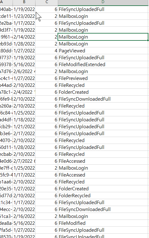 FileAccessed, MailboxLogin, FileSyncUploadedFull, FileAccessedExtended 등 여러가지 Operation 이 보인다.