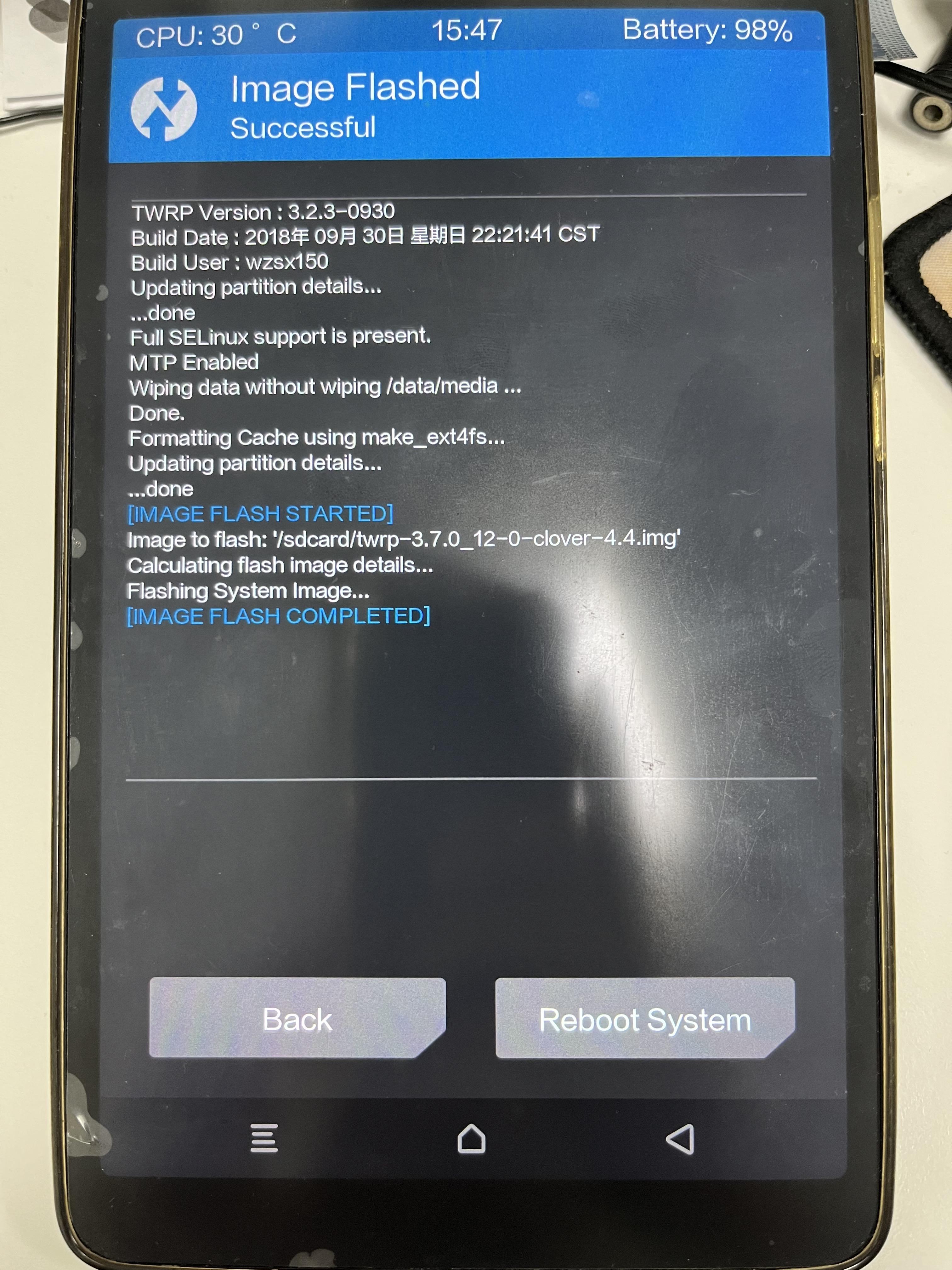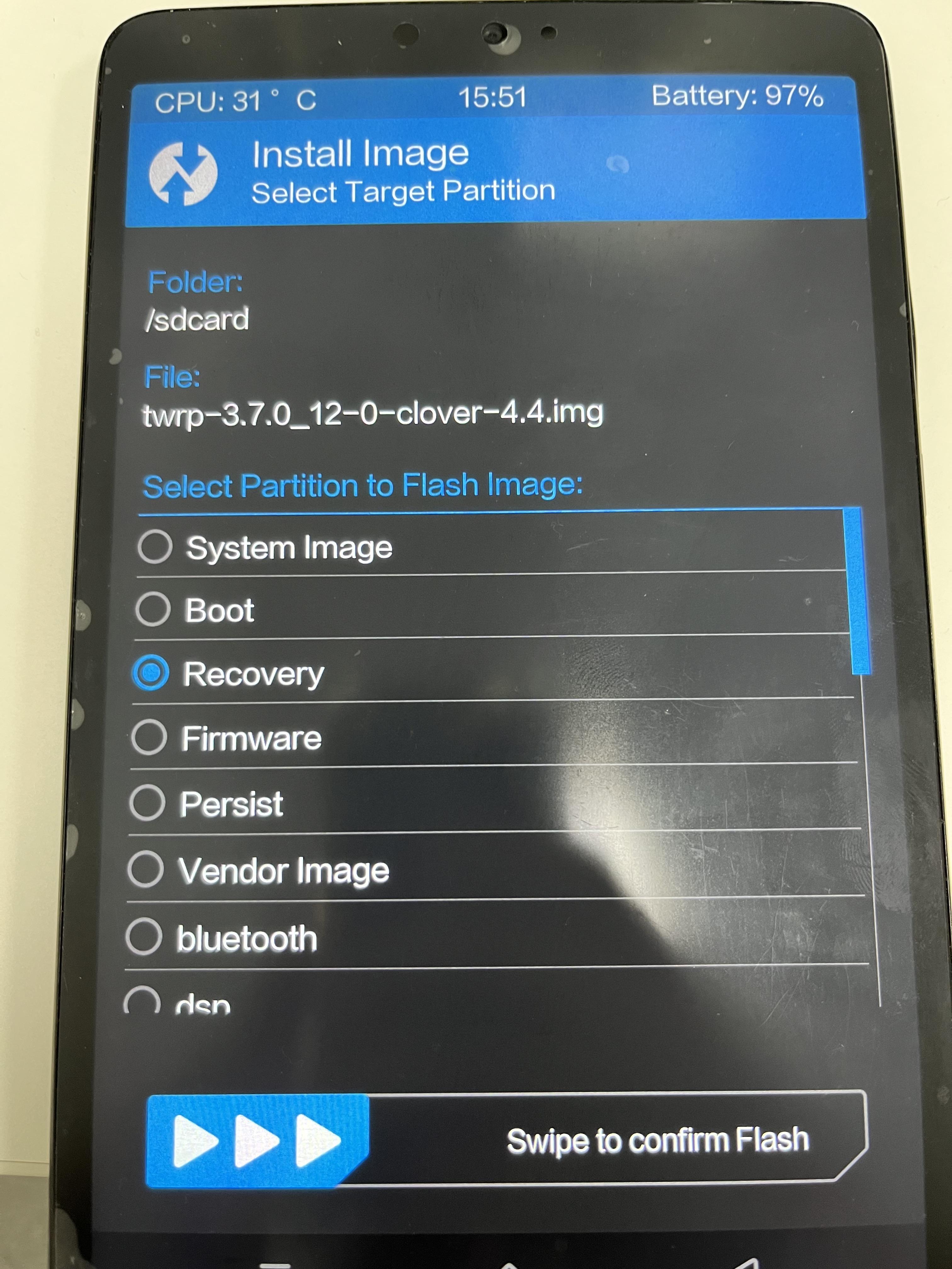 - Flash twrp-3.7.0_12-0-clover-4.4.img created by sabarop by fastboot.