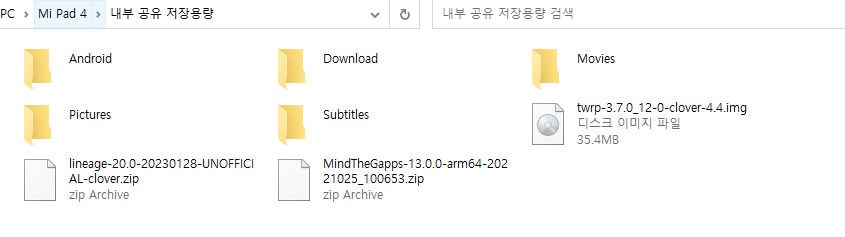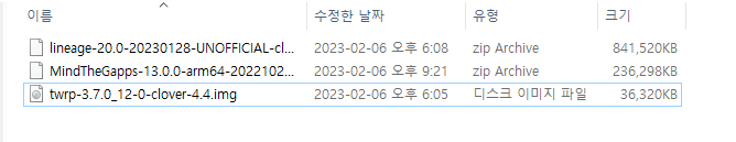 위에서 필요한 파일 twrp, gapps, lineageos 20 이미지 이렇게 3개만 있으면 된다. 위 링크 가서 다운을 받아서
