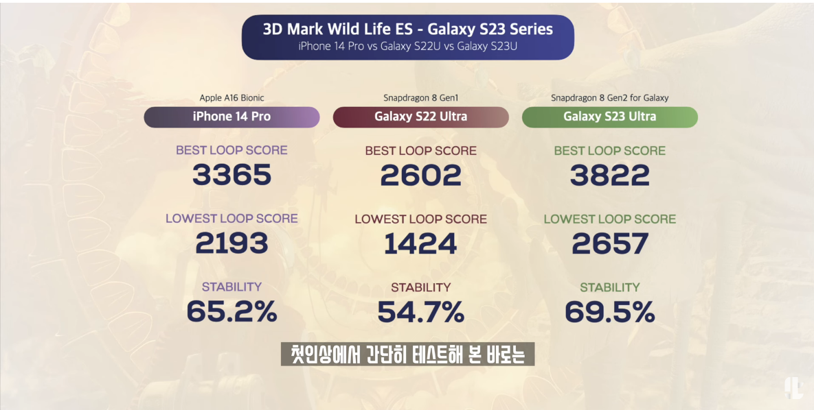또한 그래픽 성능도 벤치상으로 아이폰14 Pro 상위하는 성능을 보여주고 안정성 또안 높은 결과가 나왔다.