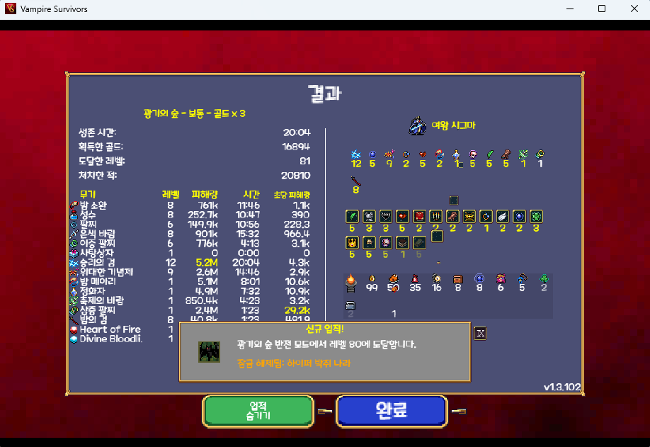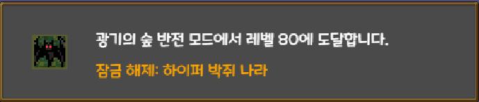 위와 같이 광기의 숲 반전 모드로 레벨 80 도달하면 업적이 깨진다.