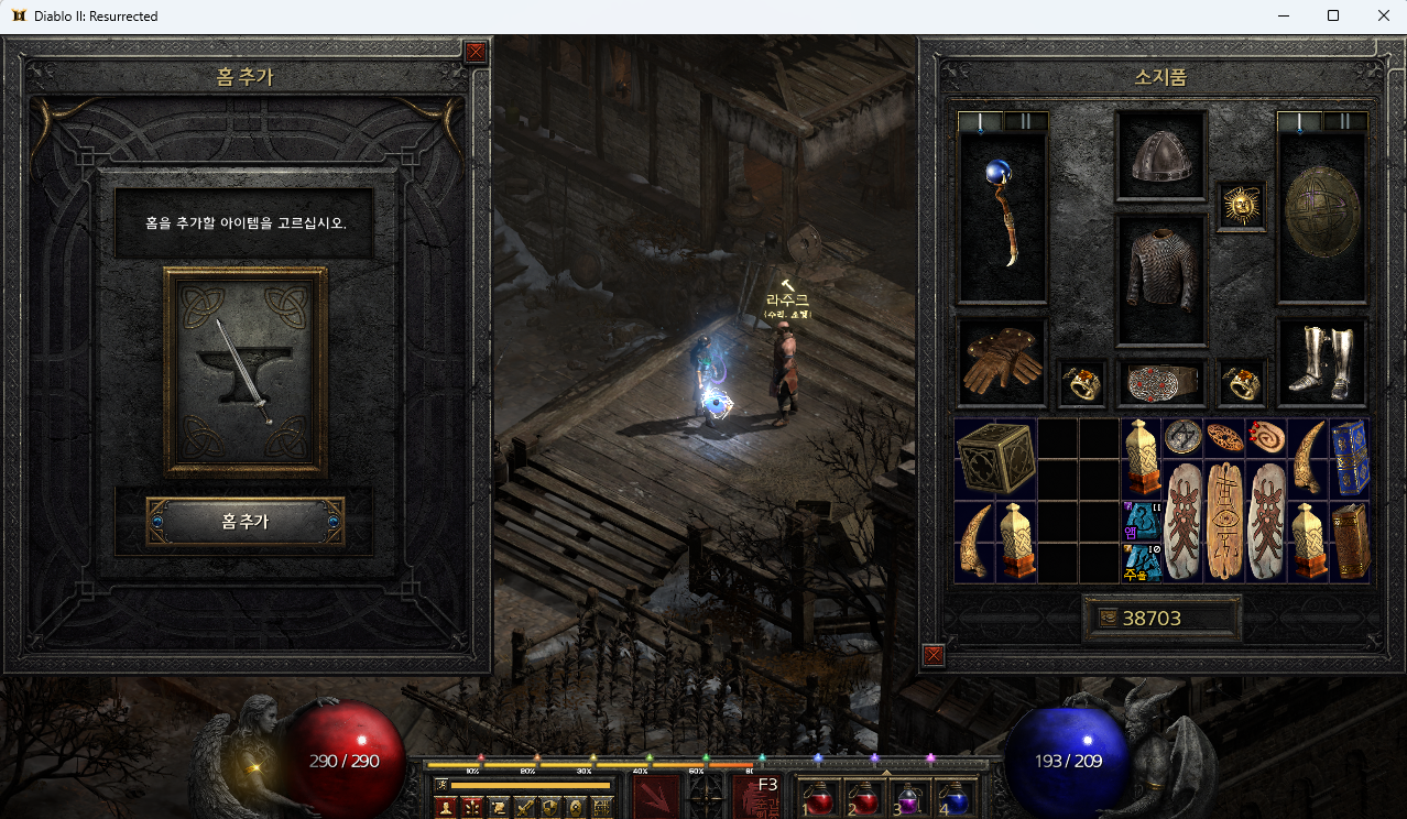 노말 엑트5에 소켓 퀘스트몹인 쉔크를 잡을때 주위 몹들이 떨구는 크리스탈소드, 브로드소드는 라주쿠한테 주면 4솟을 뚫어어준다.