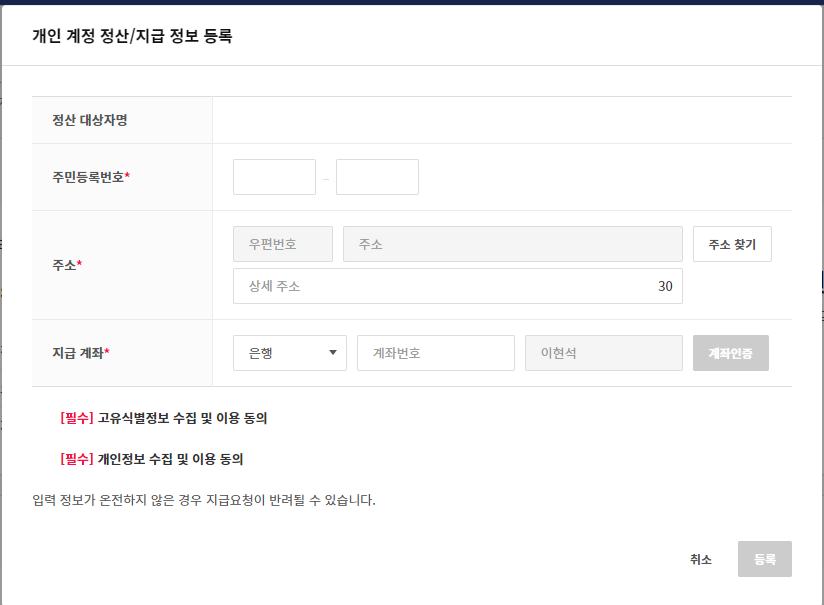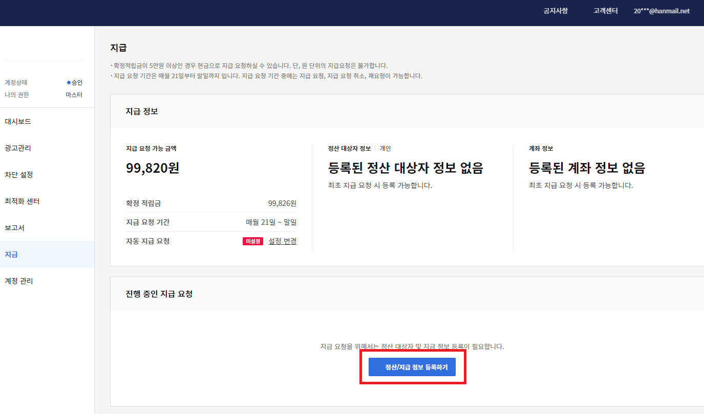 정산/지급 정보 등록하기 누르자.