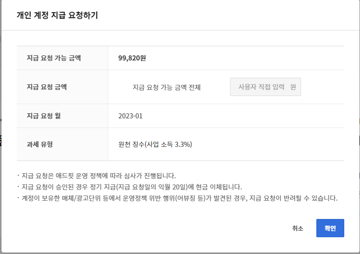 확인 누르면 된다. 원천 징수 3.3% ㅠ.ㅠ