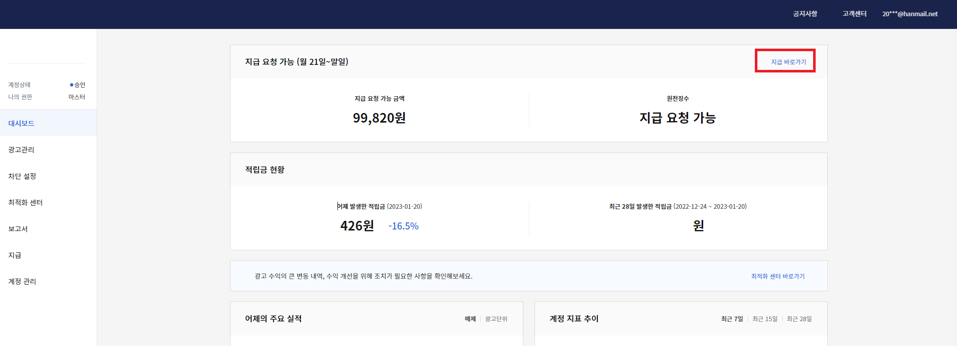 그럼 애드핏 사이트로 다시 연결되고 지급 바로가기 눌러보자.