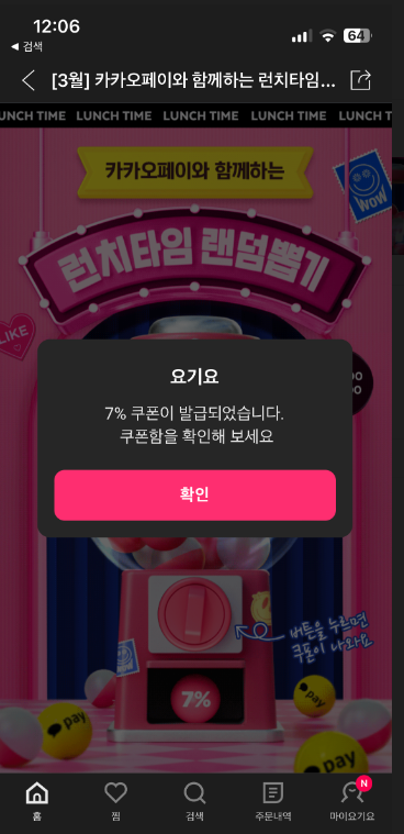 라고 메세지 뜨면서 더이상 쿠폰을 받을 수 없다. 아쉽다. 그나마 쓸수 있는 쿠폰중에 하나였는데..
