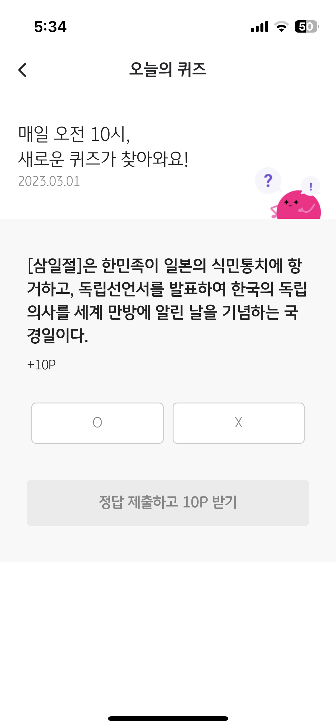 퀴즈 누르면 퀴즈가 나온다. (퀴즈는 매일 10시에 갱신 된다.)