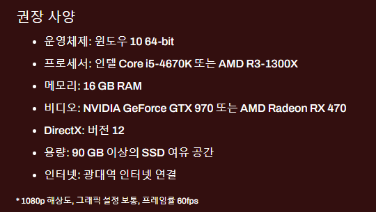9세대 이상에 GTX1060 으로 충분히 즐길수 있을듯 하다. 1080P 기준