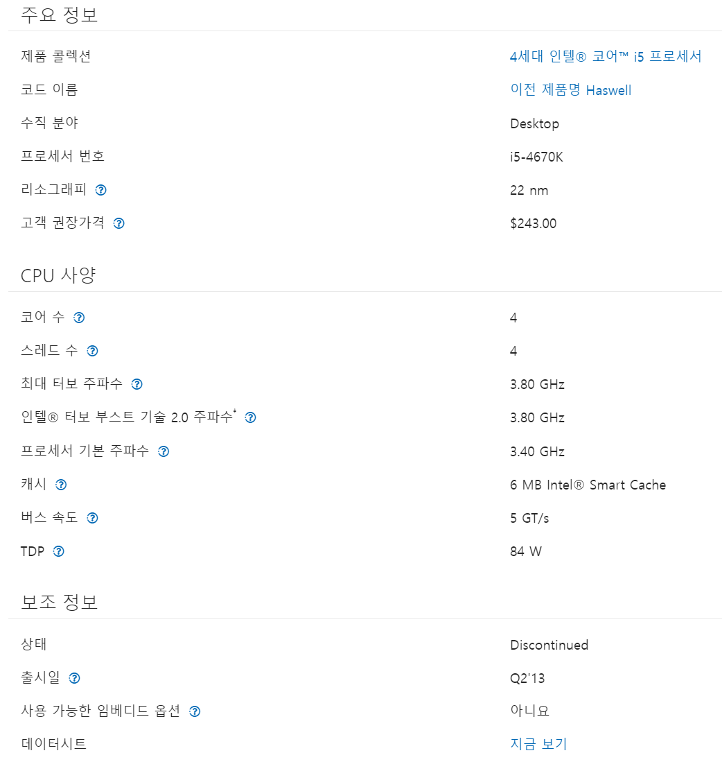 4세대 CPU도 13년 2Q에 나온제품이다. 스펙이 많이 낮다.