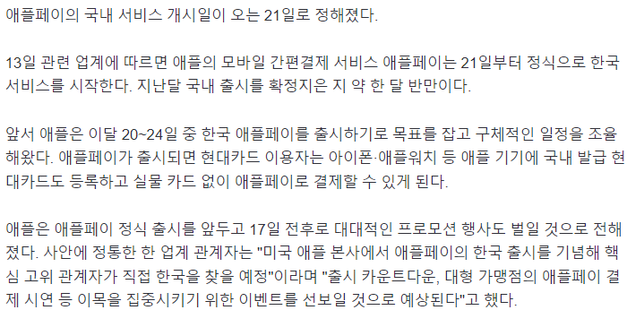 애플페이의 국내 서비스 개시일이 오는 21일로 정해졌다. 13일 관련 업계에 따르면 애플의 모바일 간편결제 서비스 애플페이는 21일부터 정식으로 한국 서비스를 시작한다. 지난달 국내 출시를