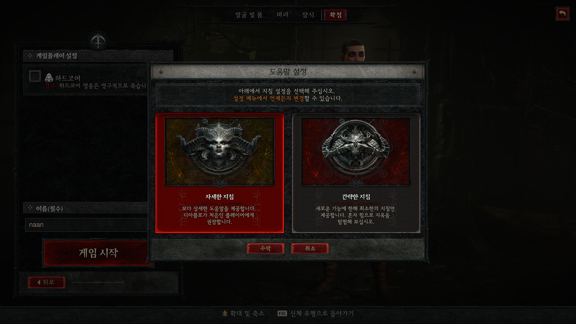 이름 설정하고 게임 시작을 하면 도움말 설정에 자세한 지침과 간략한 지침을 선택 할 수 있다.