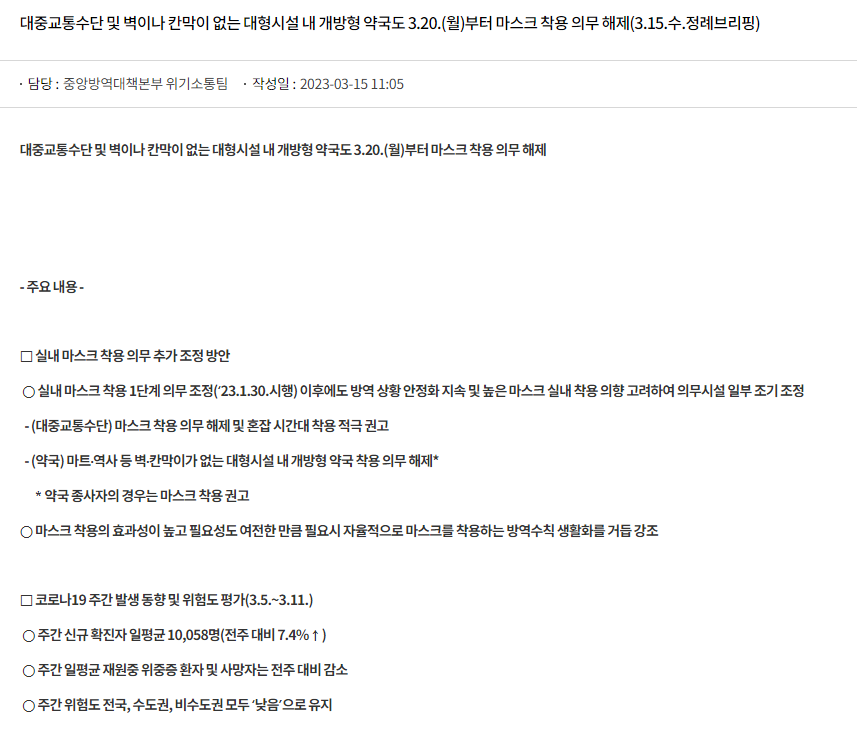 드디어 마스크 착용 의무가 2023/03/20 해제가 되었다
