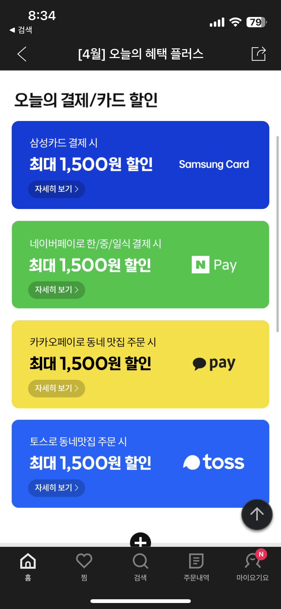카드 할인들이 있다 거의 대부분 15,000원 이상 결제시 혜택이 적용 된다.