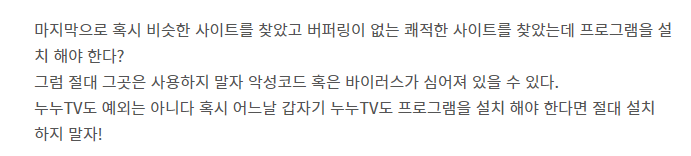 절대로 조심하자! 아직은 어플을 설치를 해야만 볼 수 있는 상태가 아니기때문에 상관없지만 의무적으로 설치를 해야지만 볼 수 있다면 이 사이트는 이용을 안하는게 좋다. 뭐 누누TV사이트가 이런식으로 운영을 할지 않할지 아무도 모른다.