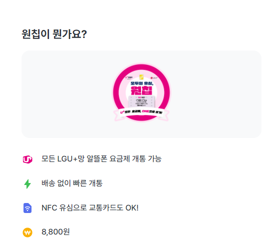 원칩은 알뜰폰 LG 망 사용 가능한 유심이다. 가격은 8,800원에 NFC 기능이 있어서 비싸다.