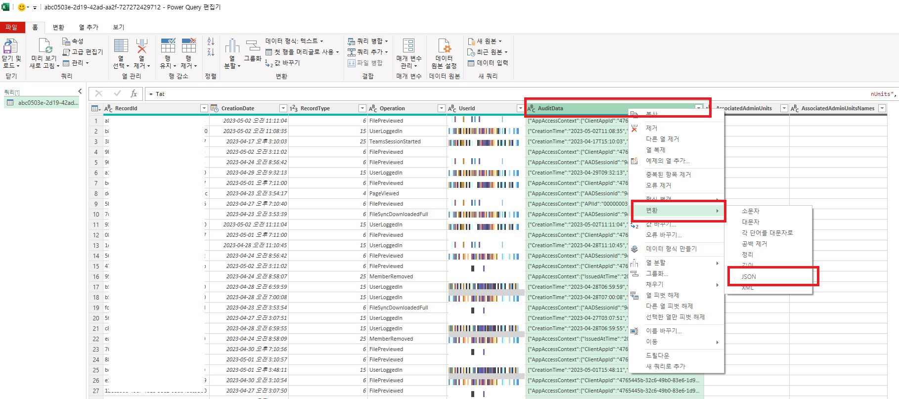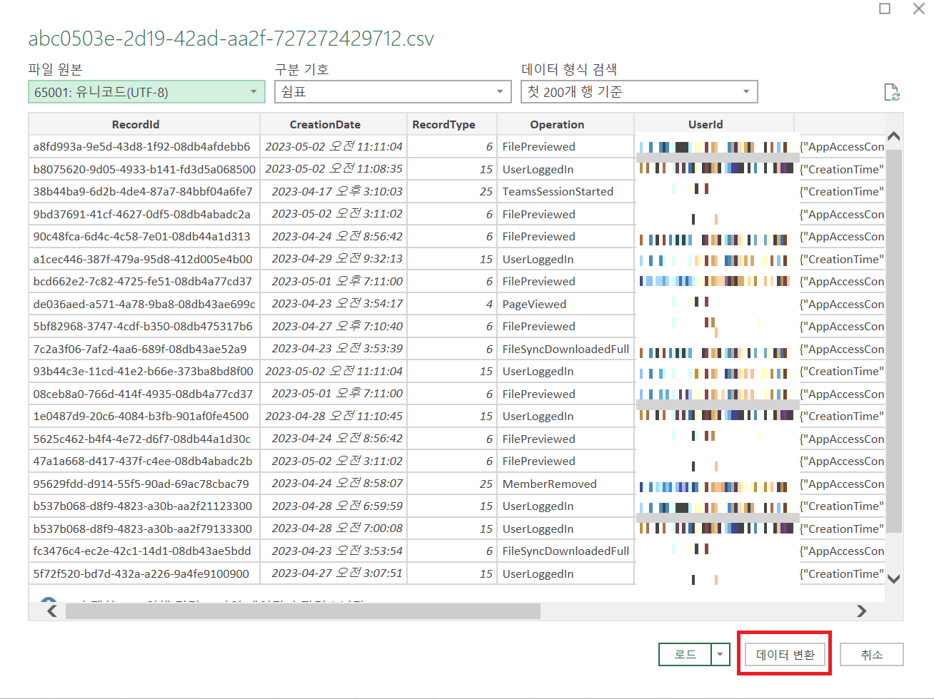 O365 감사 로그 내보내기 후 로그 변환방법이다.