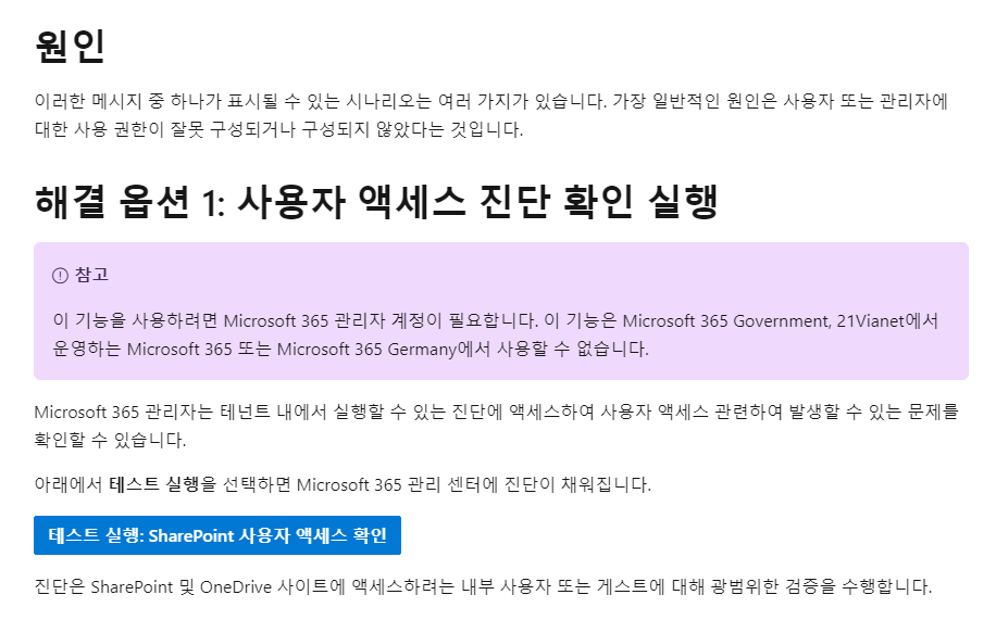 SharePoint Online 또는 비즈니스용 OneDrive를 사용하는 경우 액세스 거부, 이 사이트에 액세스할 수 있는 사용 권한 필요, 또는 디렉터리에 없는 사용자 등 특정 액세스 또는 사용 권한 오류가 수신될