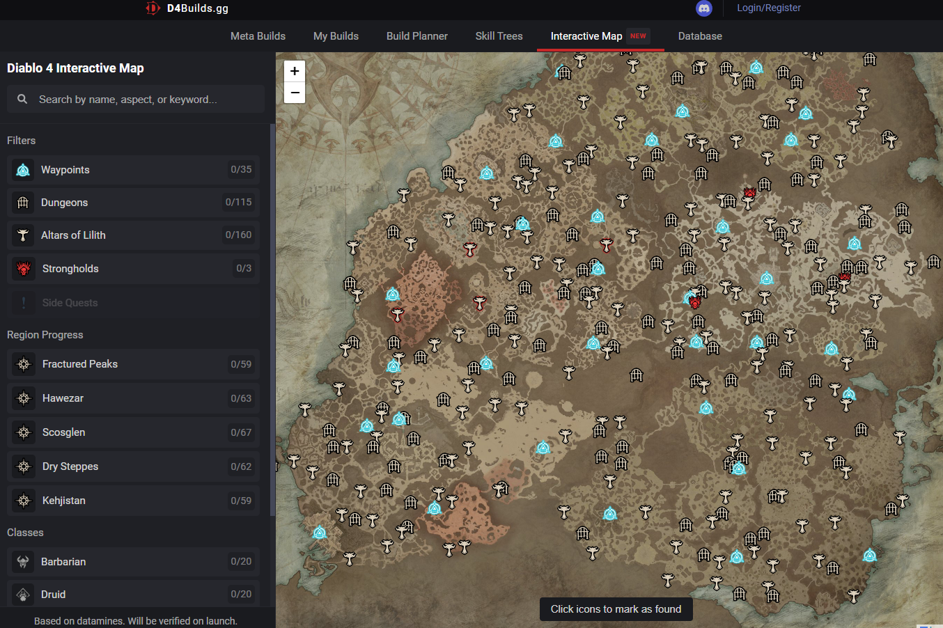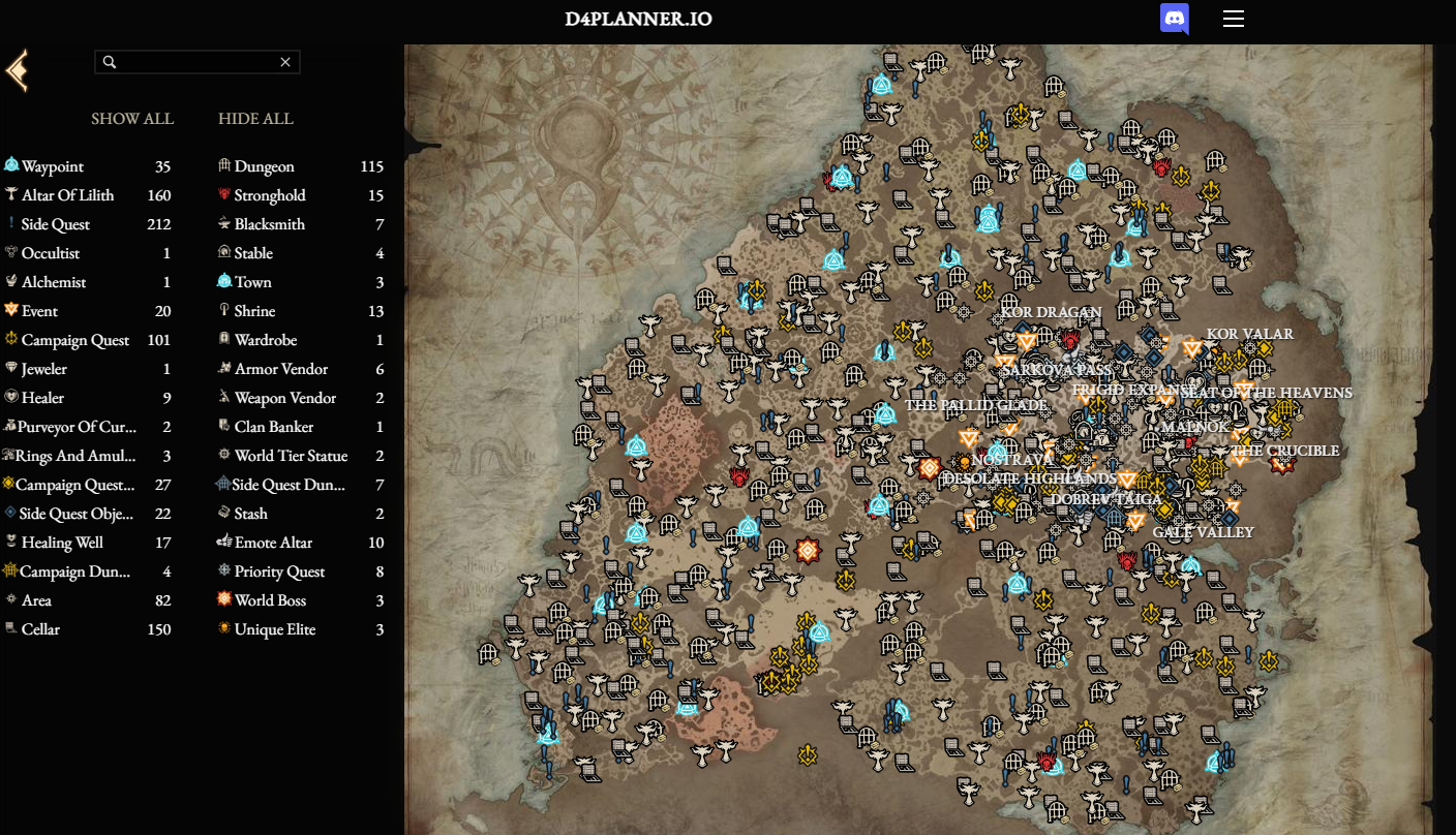 An interactive map to find the location of every Altar of Lilith, Dungeon, Stronghold, and Codex Aspects in Diablo 4.