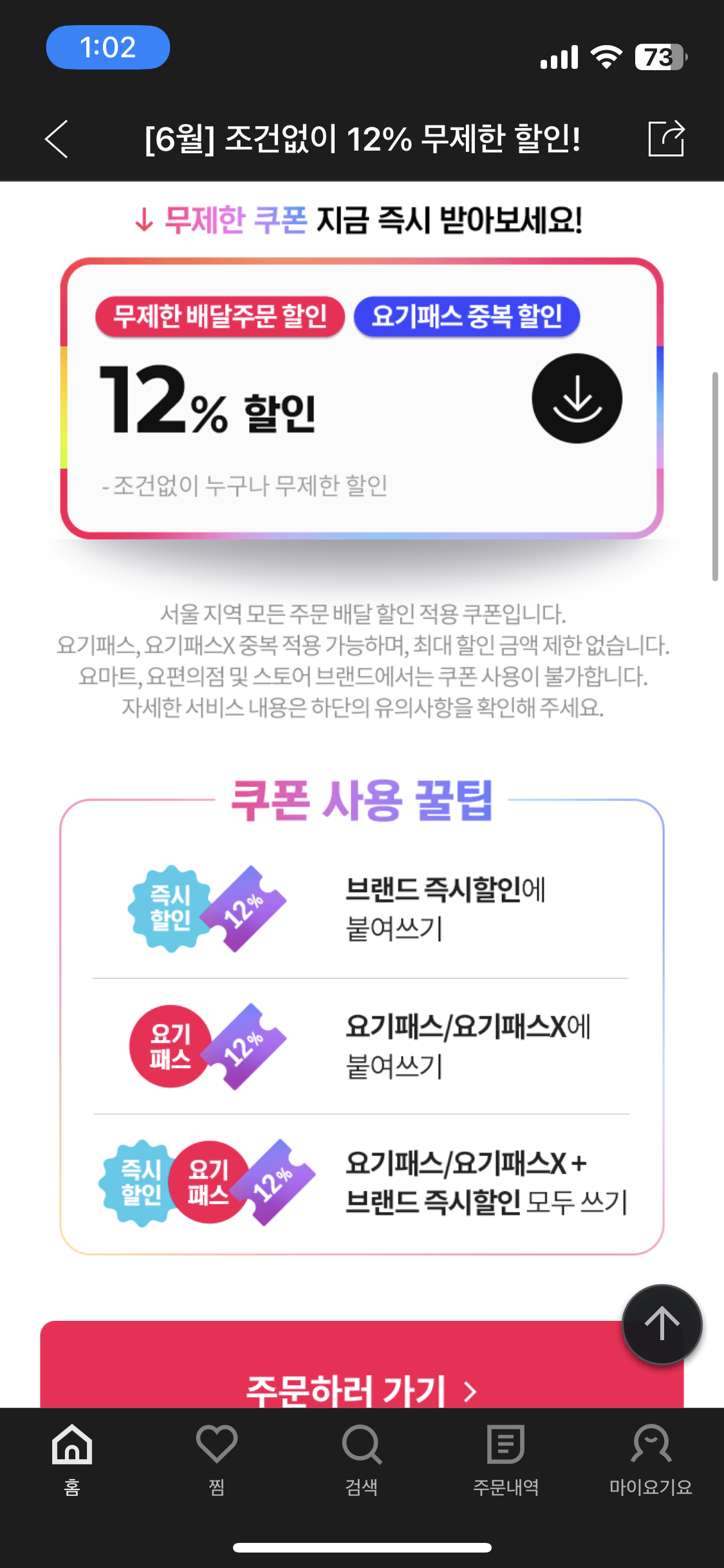 주문시 12프로 할인 쿠폰이 발급된다. 요기패스와 중복 가능하다.