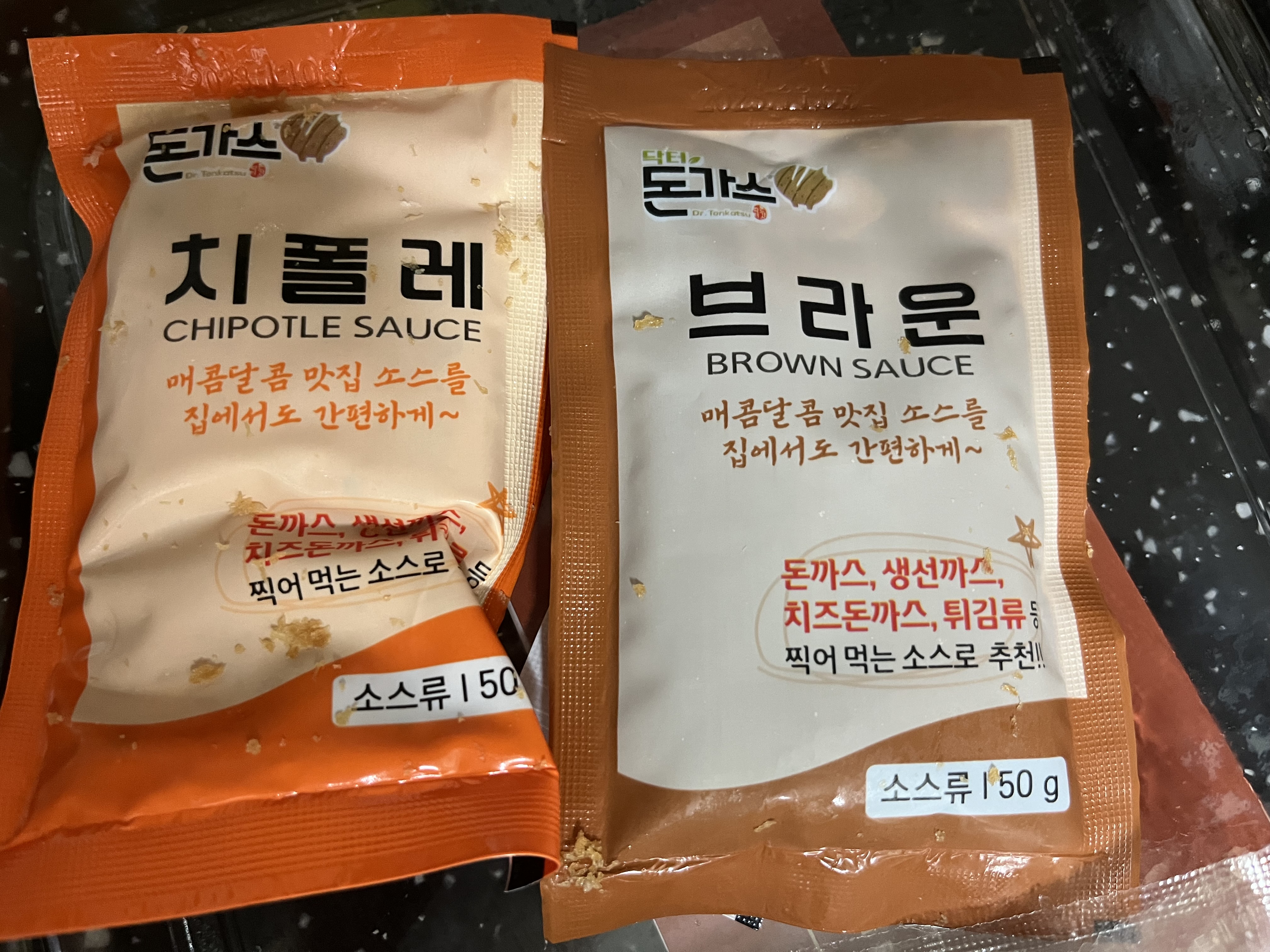 왼쪽이 브라운 소스, 오른쪽이 치폴레 소스이다.