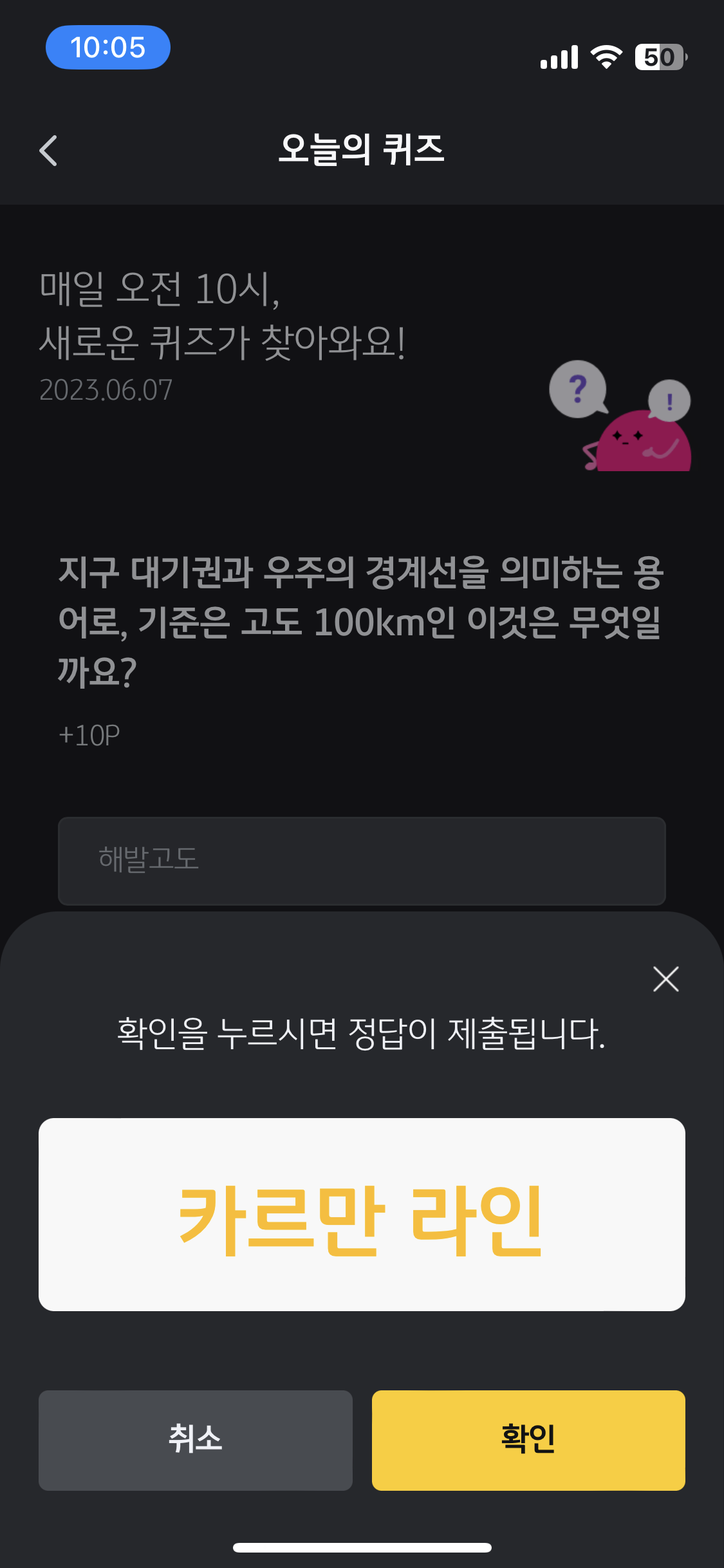 지구 대기권과 우주의 경계선을 의미하는 용어로, 기준은 고도 100km인 이것은 무엇일까요?