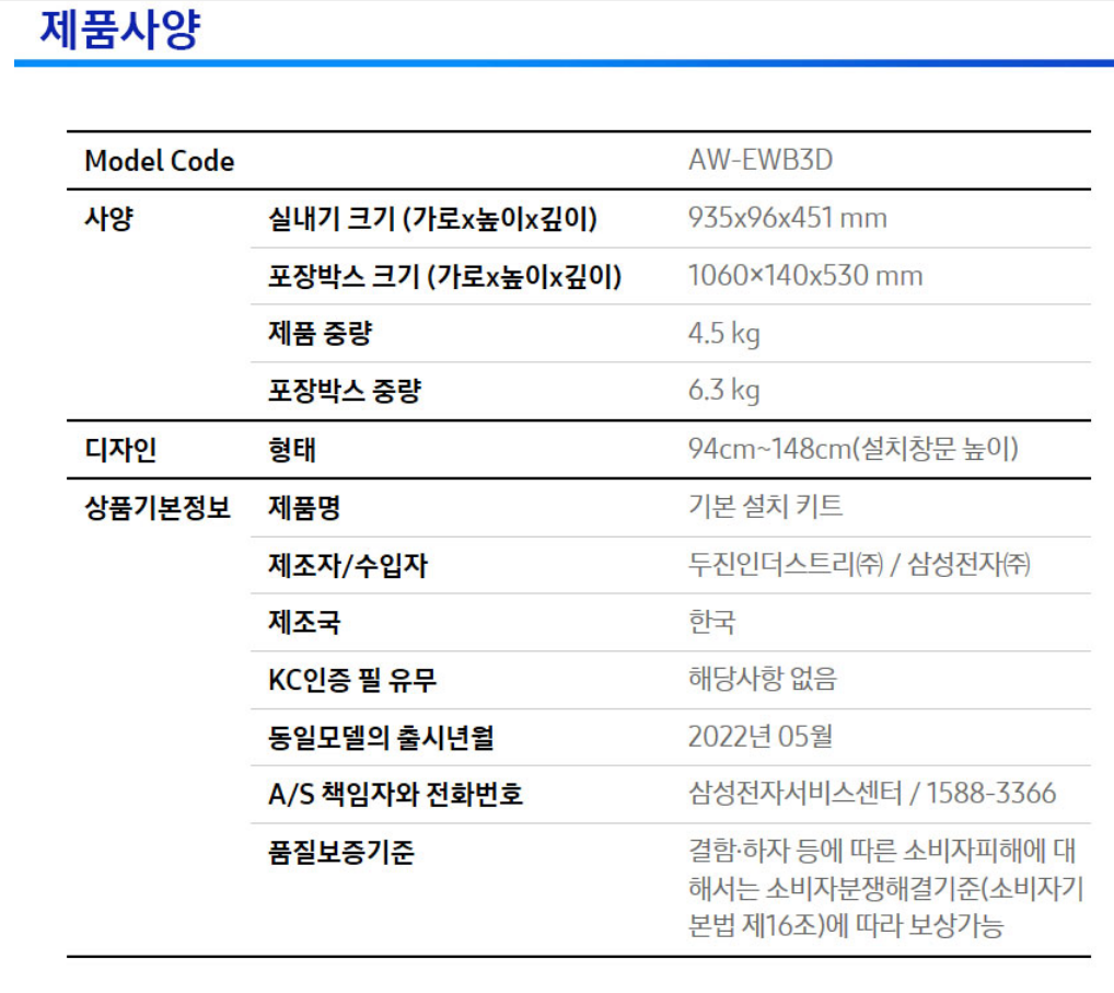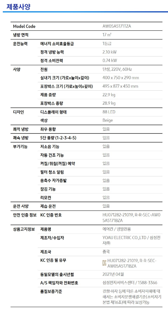 삼성 창문형 에어컨은 2021년 2022년 2023년 총 3가지가 나왔다. AW05A5171EZA 이제품은 2021년 제품이다.