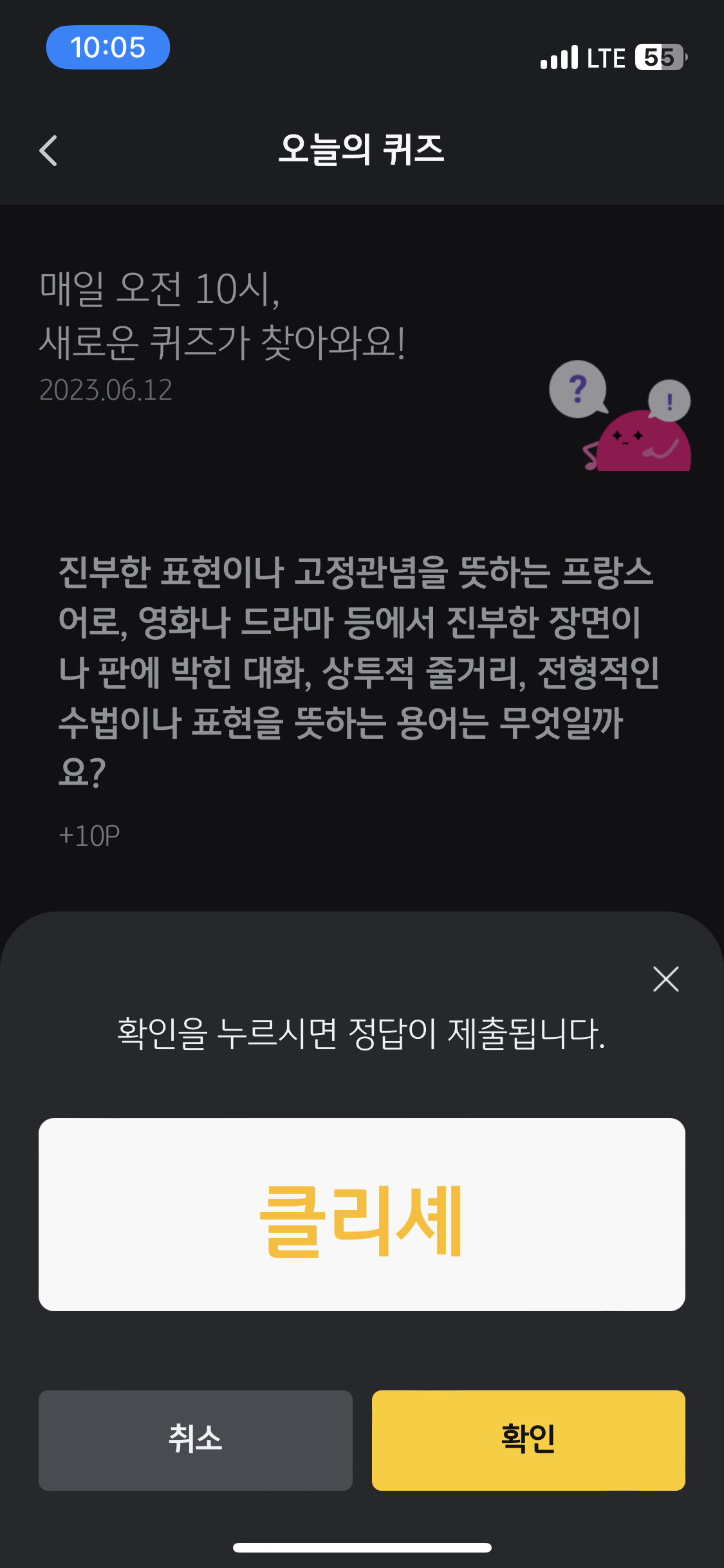진부한 표현이나 고정관념을 뜻하는 프랑스어로, 영화나 드라마 등에서 진부한 장면이나 판에 박힌 대화, 상투적 줄거리, 전형적인 수법이나 표현을 뜻하는 용어는 무엇일까요?