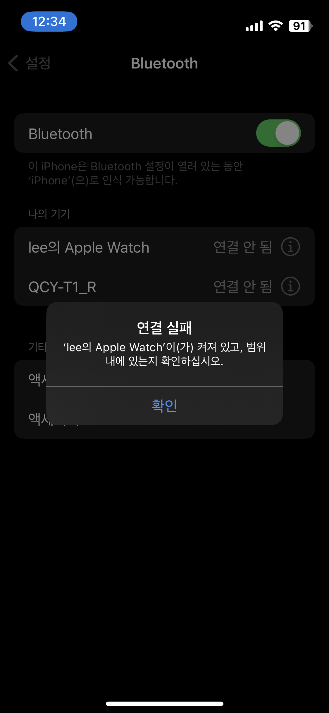 3일째 사용중에 전화가 왔는데 애플워치가 진동이 없어서 보니깐 연결이 안되어 있다. 이것저것 해봐도 안되서 휴대폰을 껐다 켰더니
